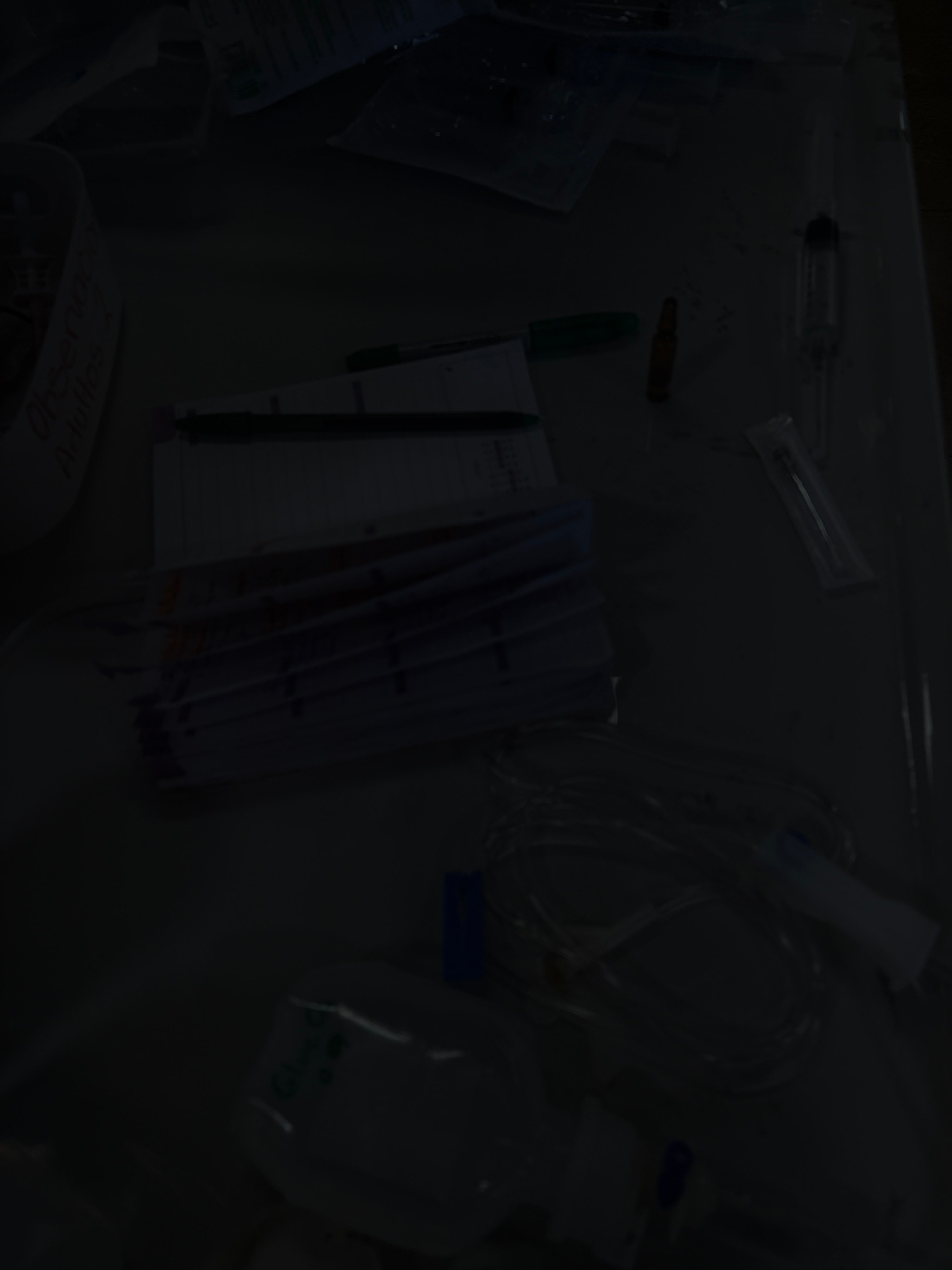 The image shows a dimly lit medical setting, possibly a hospital room. There are various medical supplies scattered across a surface, including syringes, needles, intravenous tubing, and an IV fluid b…read more