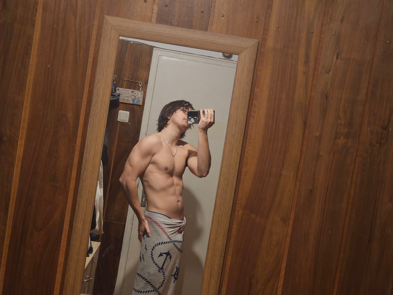 A partially nude man is using a camera to take a photograph of himself in a mirror. The man is wearing a towel wrapped around his waist. The mirror is framed with a wooden frame. The background consis…read more
