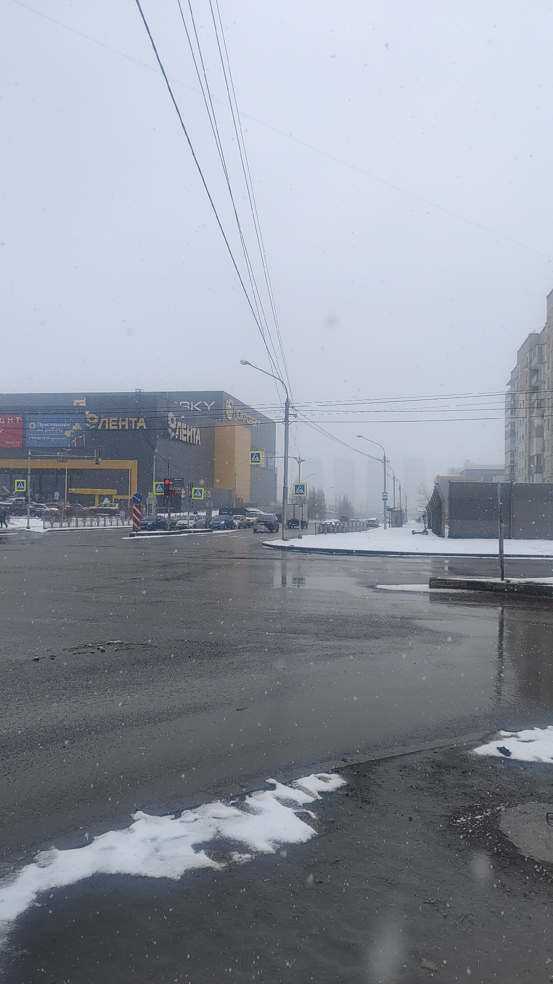 The image depicts a city intersection in Krasnoyarsk, Russia, on a snowy, overcast day. Light snowflakes are visible throughout the frame, falling onto the wet, dark asphalt roads, which show reflecti…read more