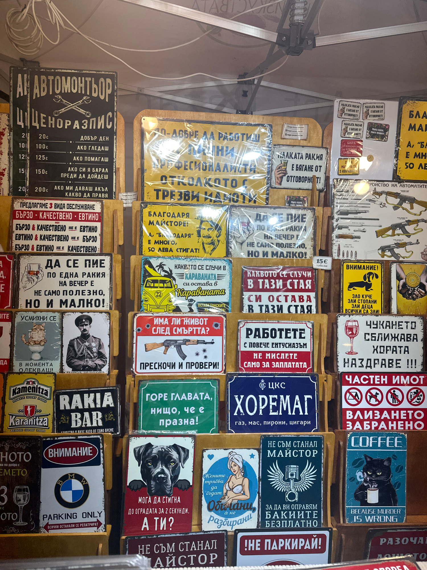 The image depicts a display of novelty metal signs for sale. The signs feature various humorous and satirical messages in Bulgarian. The signs are organized in rows, appearing to be stacked on a table…read more