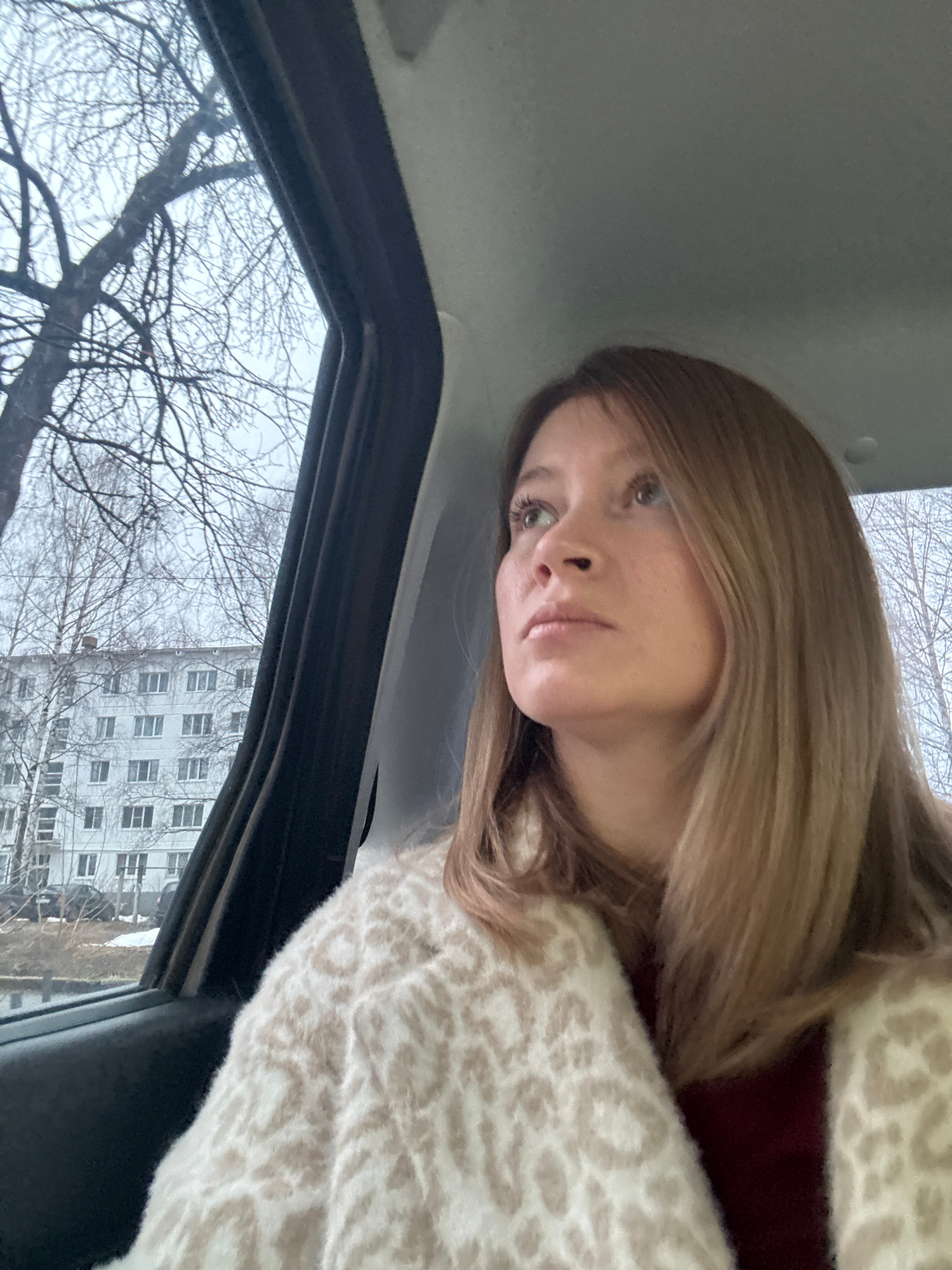 A woman with light brown hair is inside a vehicle. She is wearing a patterned, possibly leopard-print, fuzzy cardigan over a maroon top. The view through the car window shows bare trees and a buildingβ¦read more