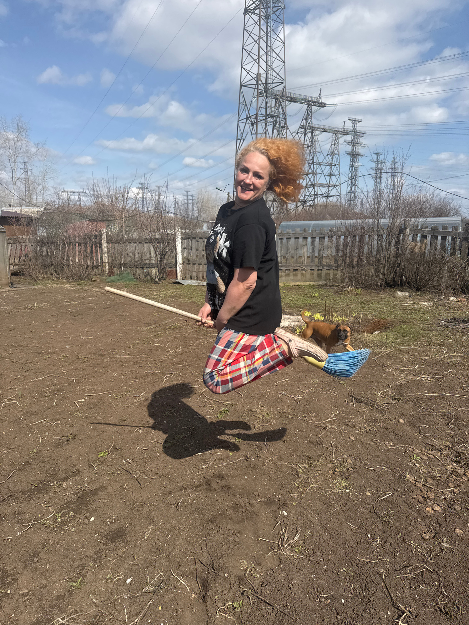 A woman with reddish-orange hair is in a yard in Chaikovsky, Russia, holding a wooden stick. She wears a black shirt, a plaid skirt, and white Crocs with a blue broom attached to one. A dog stands nea…read more