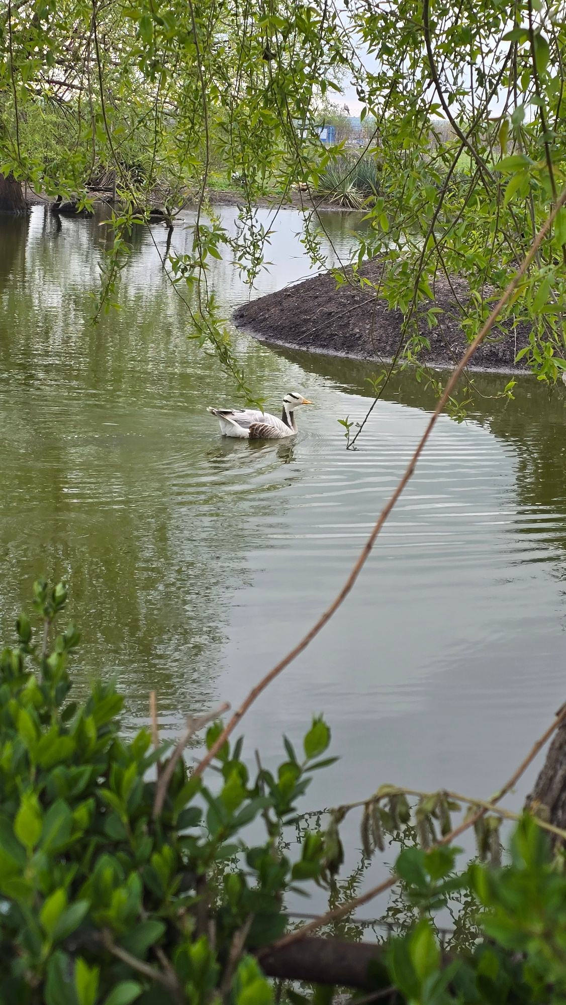 The image shows a body of water, possibly a canal or lake, framed by green foliage on both sides. A goose is swimming in the water, near a shoreline. The photograph was taken in Burgas, Bulgaria. A small building is seen on the left near the tree branches. | Open Wire