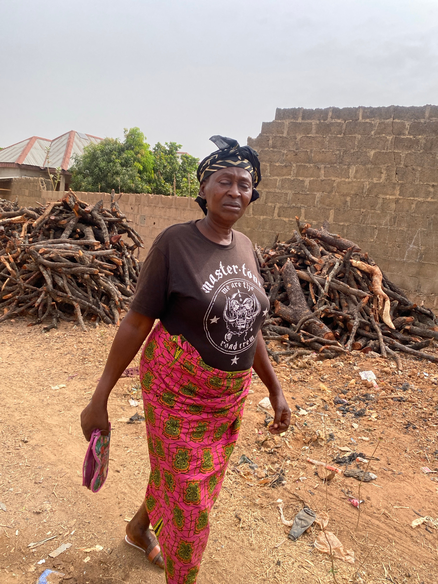 An elderly woman stands in an outdoor environment. She is wearing a dark brown t-shirt, a pink and green patterned skirt, and a headscarf. She is holding a pink wallet in her right hand. Two piles of firewood are located behind her, one near a brick wall and another near a building with a metal roof. The ground is dirt and littered with trash. The photo was taken in Rido, Nigeria. | Open Wire