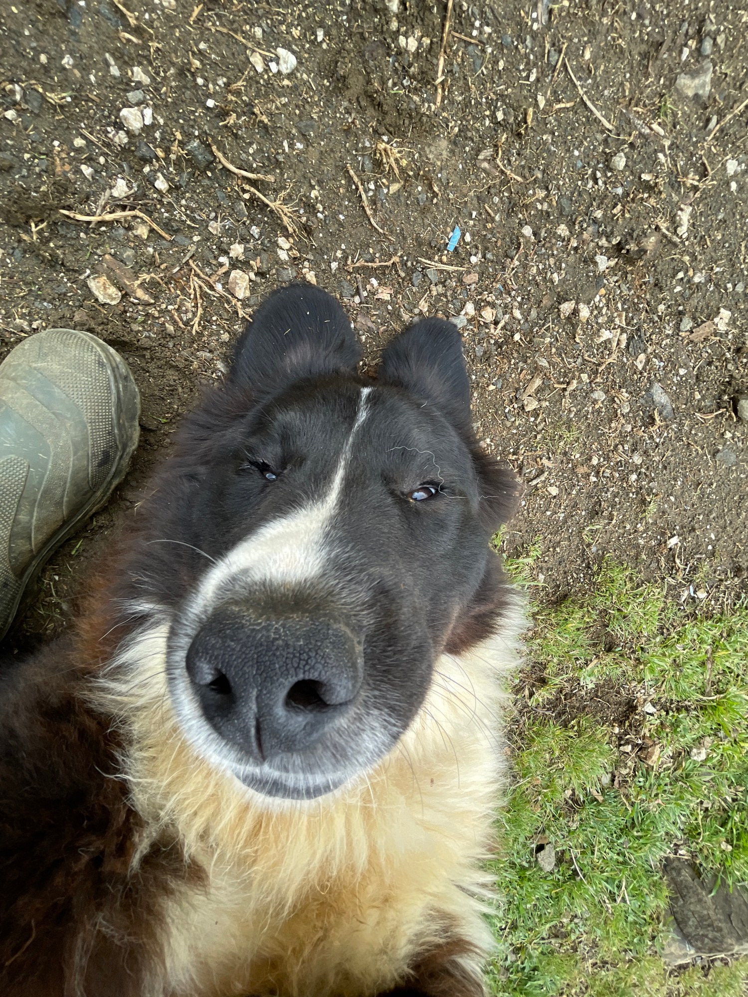 A black, white, and tan dog lies on its back, head tilted, with partially closed eyes, positioned adjacent to a person's left boot. The dog's prominent black nose and white facial blaze are centered i…read more