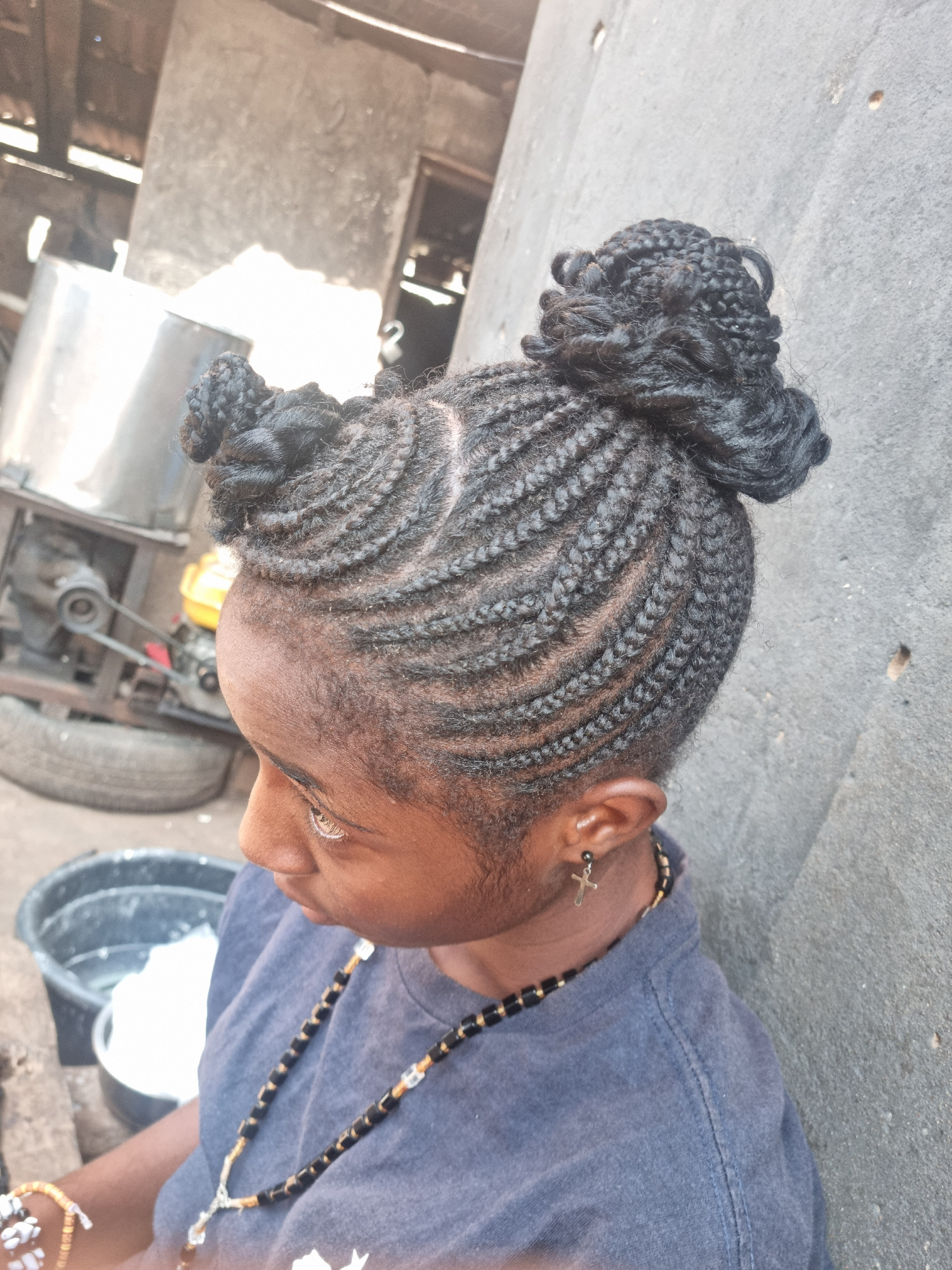 This media file captures a close-up, slightly high-angle view of a person with dark skin, focusing on their head and upper body. The person's hair is styled in neat, intricate cornrows that lead into…read more
