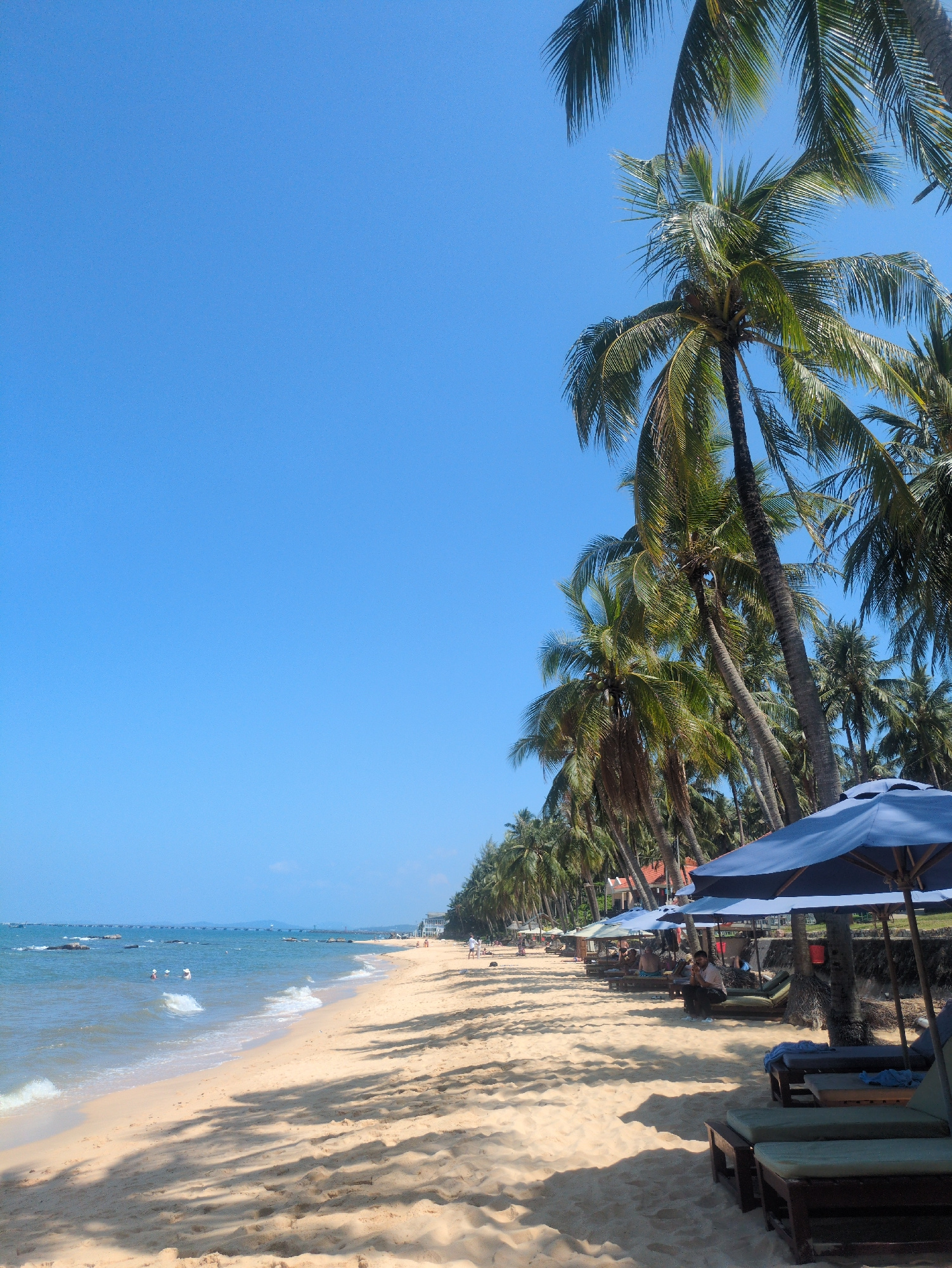 The image depicts a beach scene in Phú Quốc, Vietnam. A line of palm trees borders the sandy beach, with their shadows stretching across the sand. Blue beach umbrellas and lounge chairs are set up for…read more
