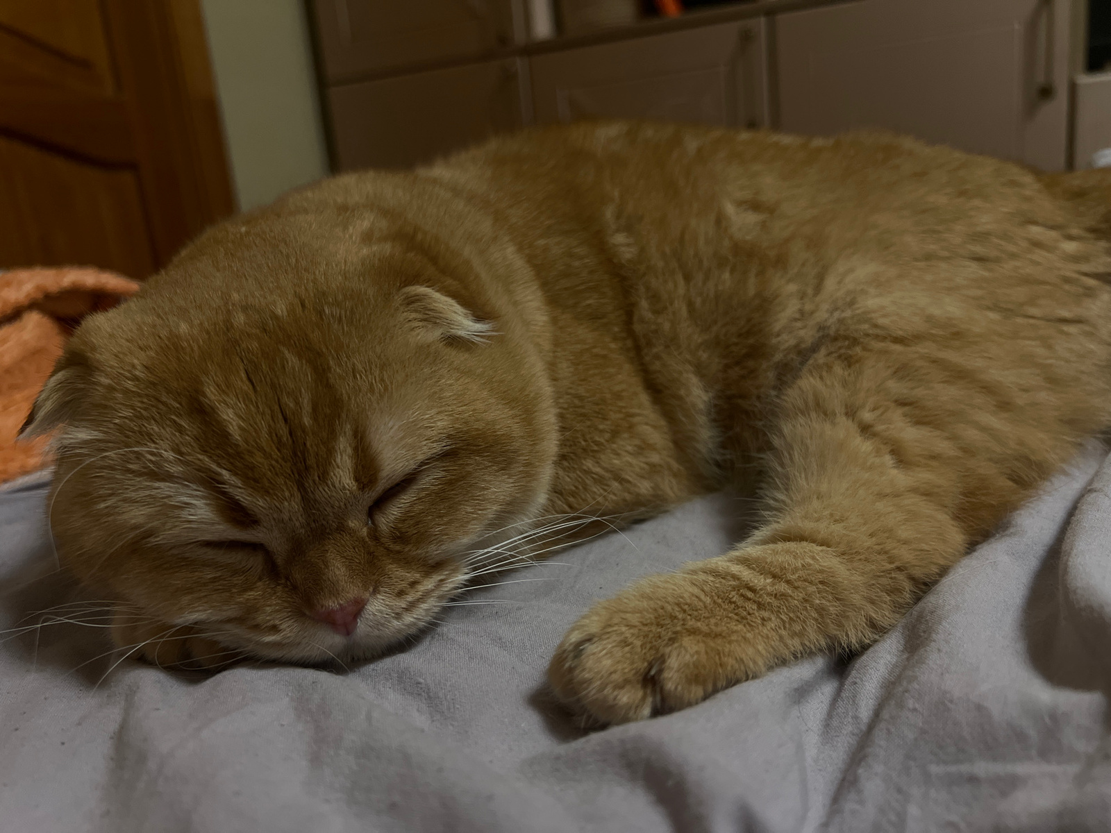 A ginger Scottish Fold cat is captured in a close-up, indoor shot, sleeping peacefully on a light grey bed sheet or blanket. The cat is curled up, with its eyes gently closed and its head resting on i…read more