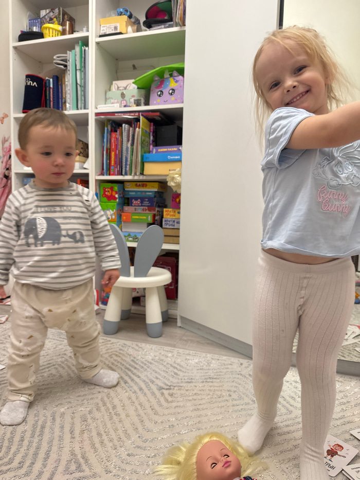 Two children are in the frame. One, a girl, is older with blonde hair, wearing a light blue top with the words "Funny Bunny" on it, and cream leggings. She is smiling at the camera. The other child, a…read more