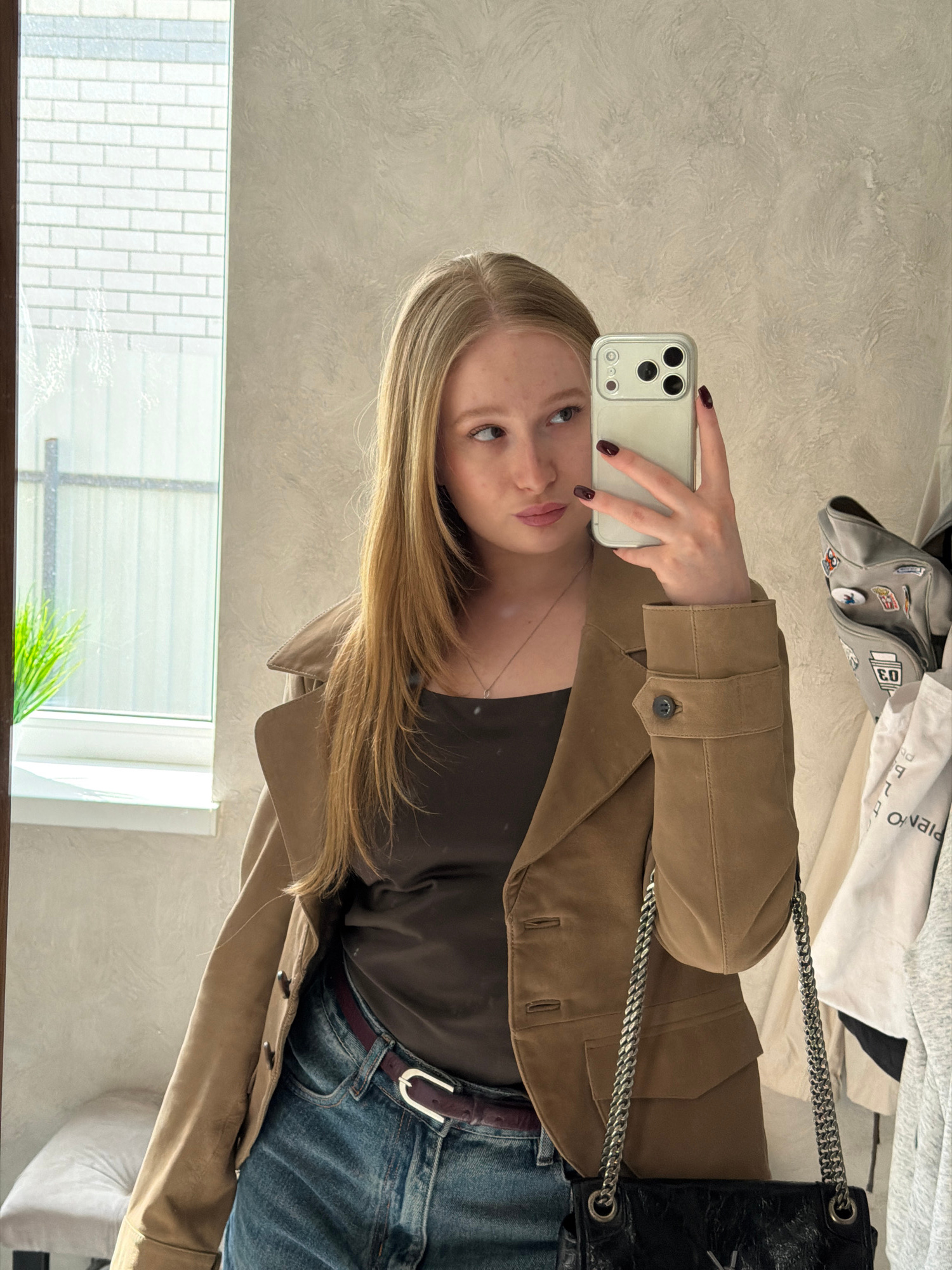 A young woman is taking a selfie in a mirror. She is wearing a brown long-sleeved shirt, a tan jacket, and blue jeans with a maroon belt. The woman is holding a white iPhone. A black purse with a silv…read more