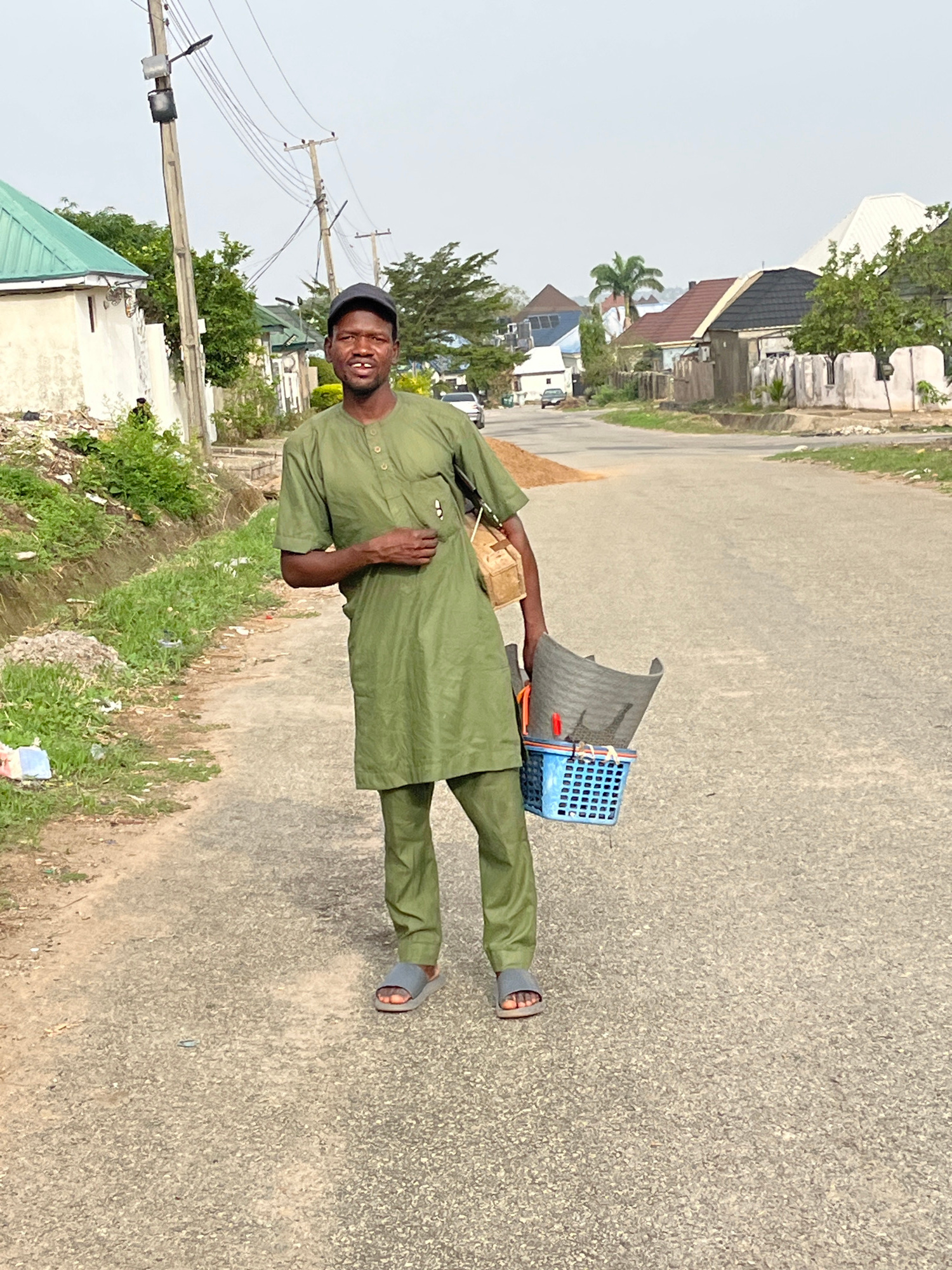 A man stands on a paved road in Abuja, Nigeria. He is wearing an olive green tunic and trousers, a dark cap, and grey sandals. He is carrying a blue and grey crate containing miscellaneous items. The…read more