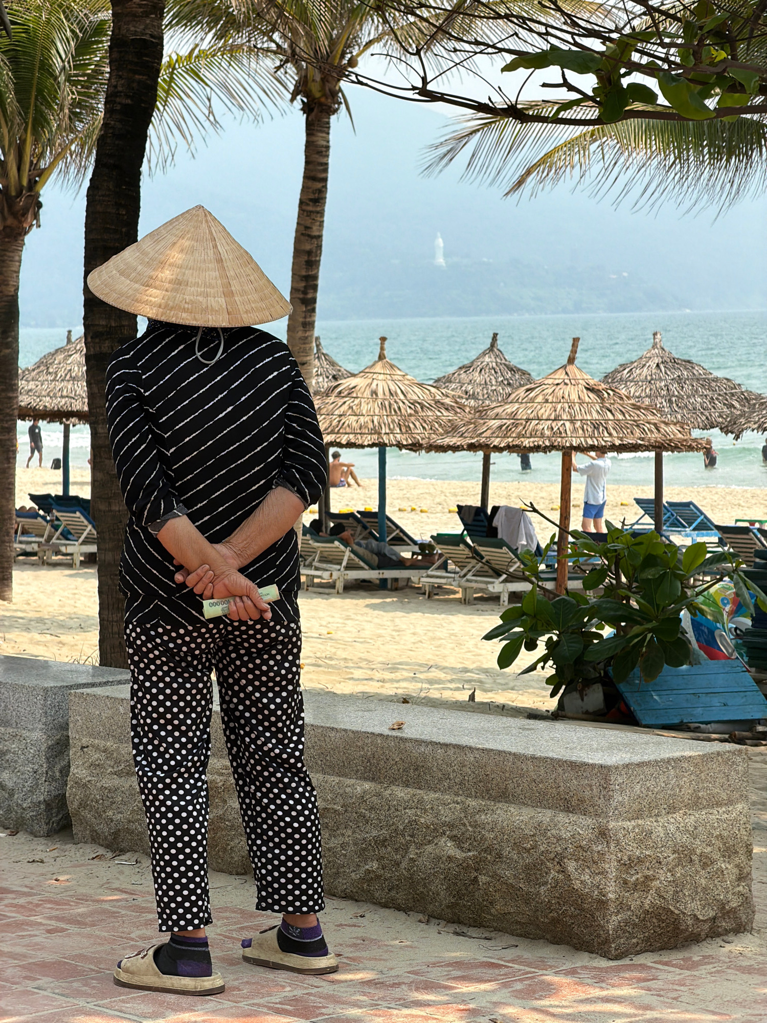 A person is standing on a sidewalk next to a set of stone stairs, with a beach scene in the background. The person is wearing a conical Asian hat, a black and white striped shirt, and black pants with…read more