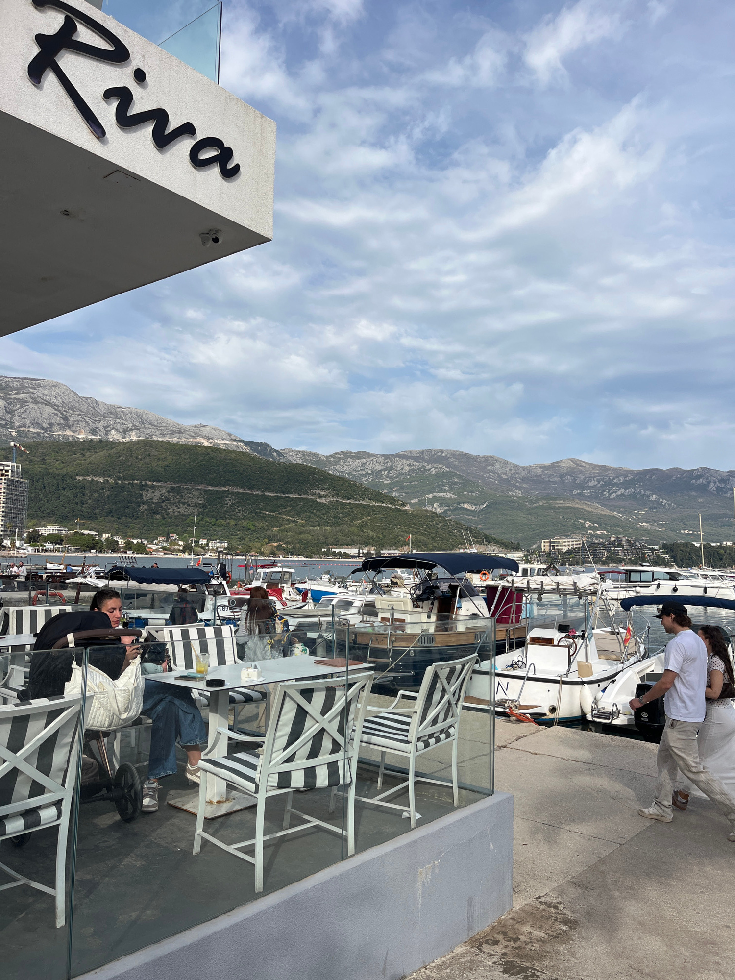 The scene shows an outdoor dining area with a view of a marina and mountains, likely located in Budva, Montenegro. A sign with the word "Riva" is prominently displayed on a building. Several people ar…read more