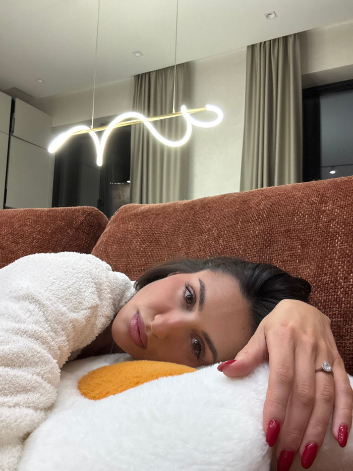 An adult female is depicted in a reclined position on an orange-brown textured sofa in an indoor setting in Khimki, Russia. The female, with dark hair and apparent facial makeup, wears a white, fuzzy, long-sleeved garment. She is looking directly at the camera. Her head rests on a white, fuzzy pillow with a prominent orange circular design. Her right hand, featuring red-painted fingernails, is visible, with a clear, pear-shaped stone ring on her right ring finger. In the background, a modern, linear pendant light fixture with a luminous wavy element is suspended from a white ceiling, which also contains recessed lighting. Light-colored curtains are drawn, obscuring a window or glass door behind the sofa. | Open Wire