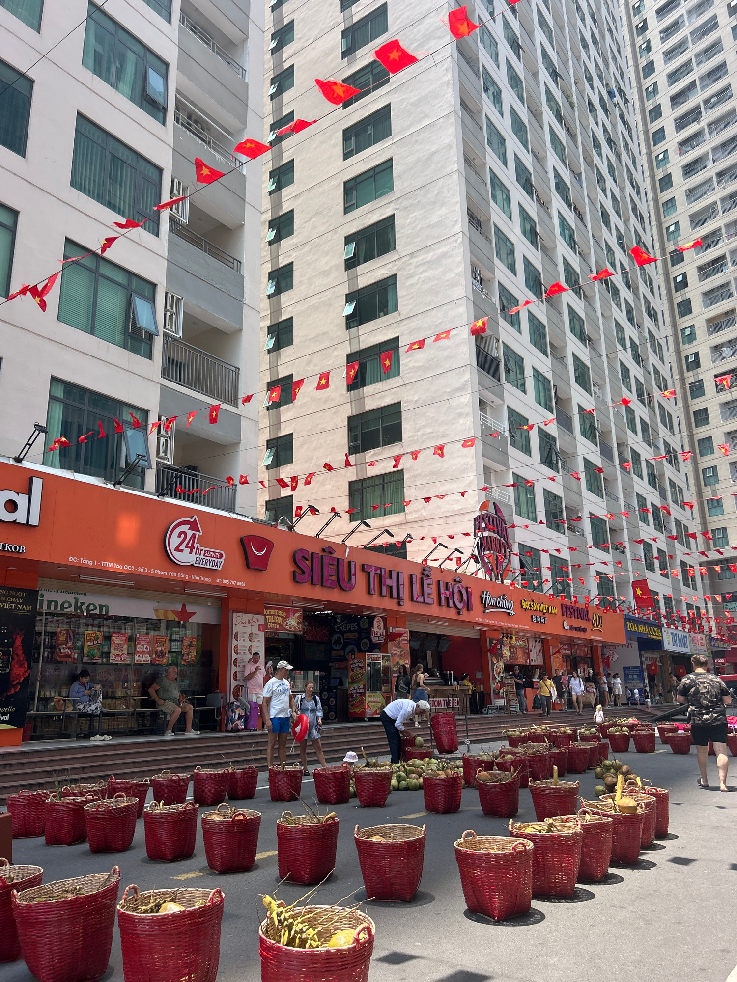 The image depicts an outdoor scene in Nha Trang, Vietnam, specifically near the 'Siêu Thị Lễ Hội' festival supermarket. The supermarket's large orange signage is visible. Many red Vietnamese flags are…read more