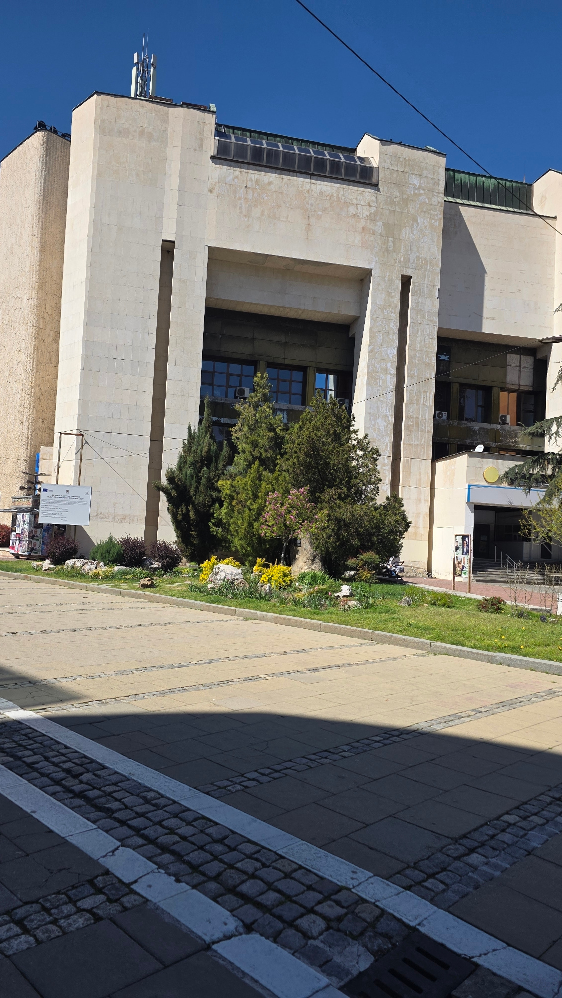 The image depicts a building in Blagoevgrad, Bulgaria, viewed from a slightly oblique angle. The architecture of the building is modern and imposing, with a light-colored facade and a distinct geometrβ¦read more