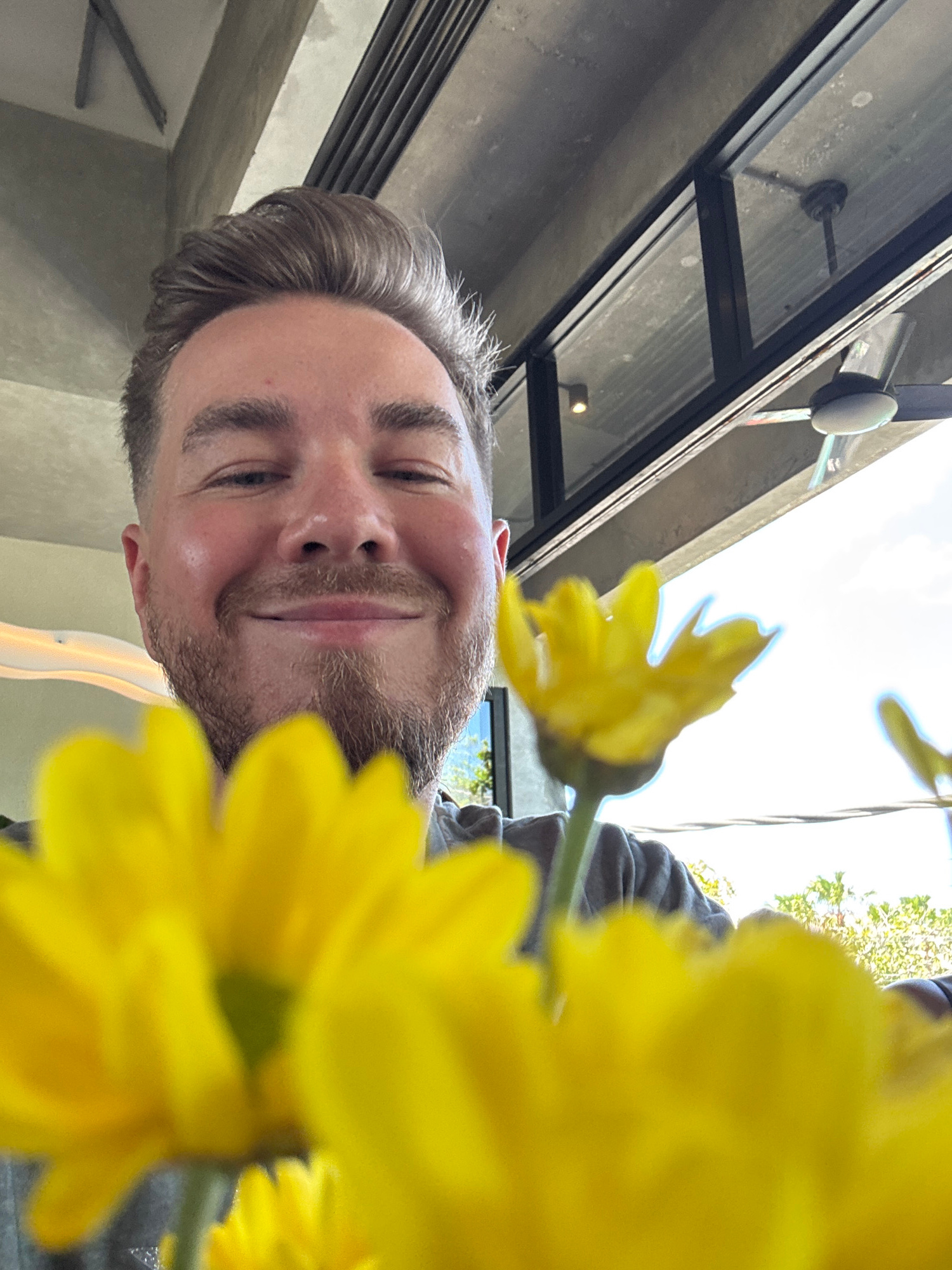 A close-up portrait depicts a man with light skin, brown hair, and a beard, positioned to the left of the frame. His face is smiling slightly. Yellow flowers partially obscure the right side of the im…read more