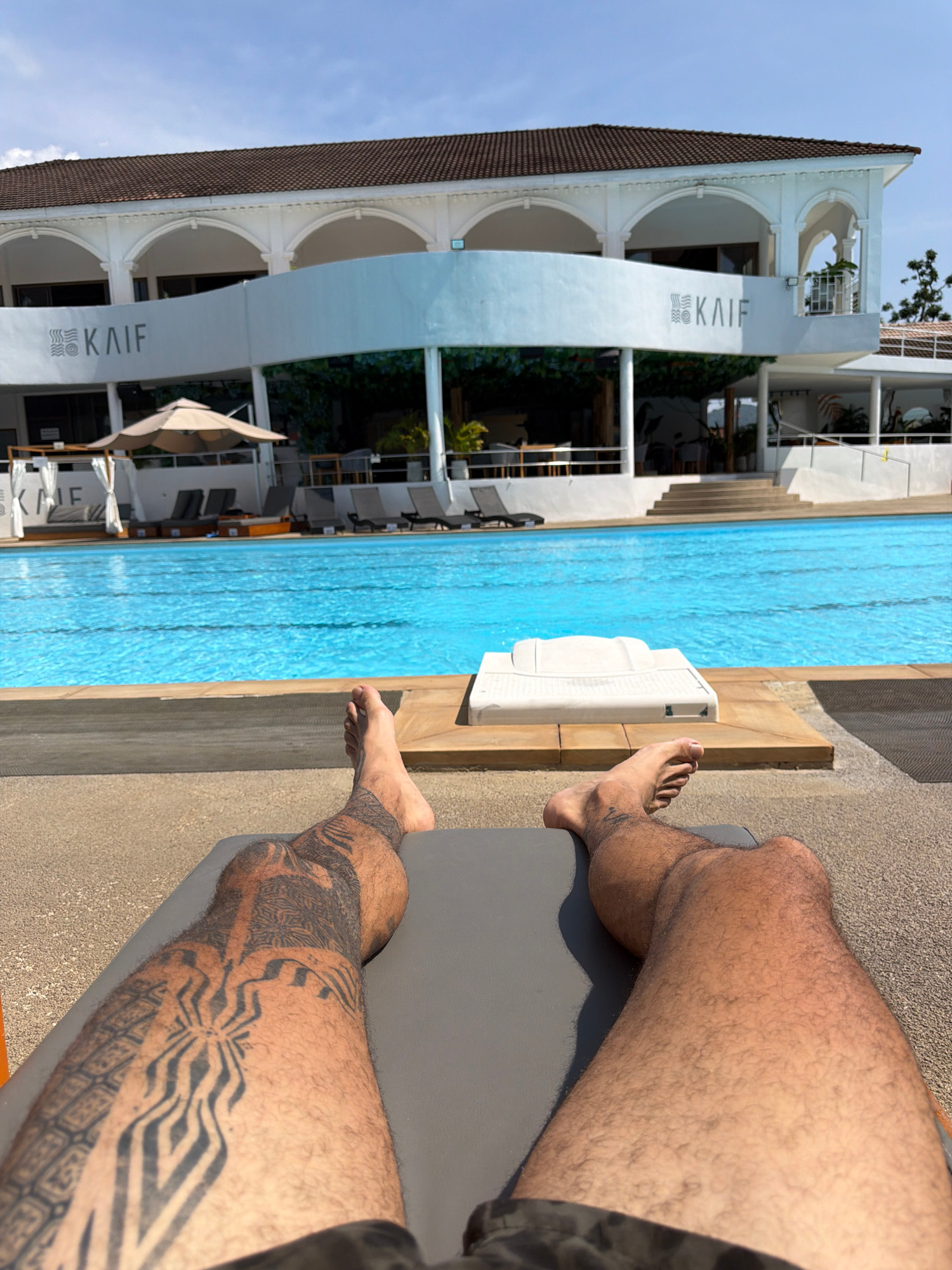 A first-person, eye-level perspective captures a person relaxing poolside at the KAIF Cafe & Eatery in Kathu, Thailand. The person's bare legs are visible in the lower and right portions of the frame,…read more