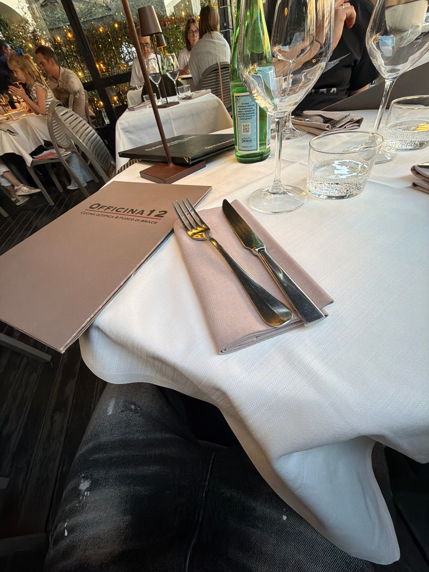 The image shows a table setting at the restaurant Officina 12 in Milan, Italy. The table is covered with a white tablecloth and set with silverware wrapped in a light brown napkin, water glasses, and…read more