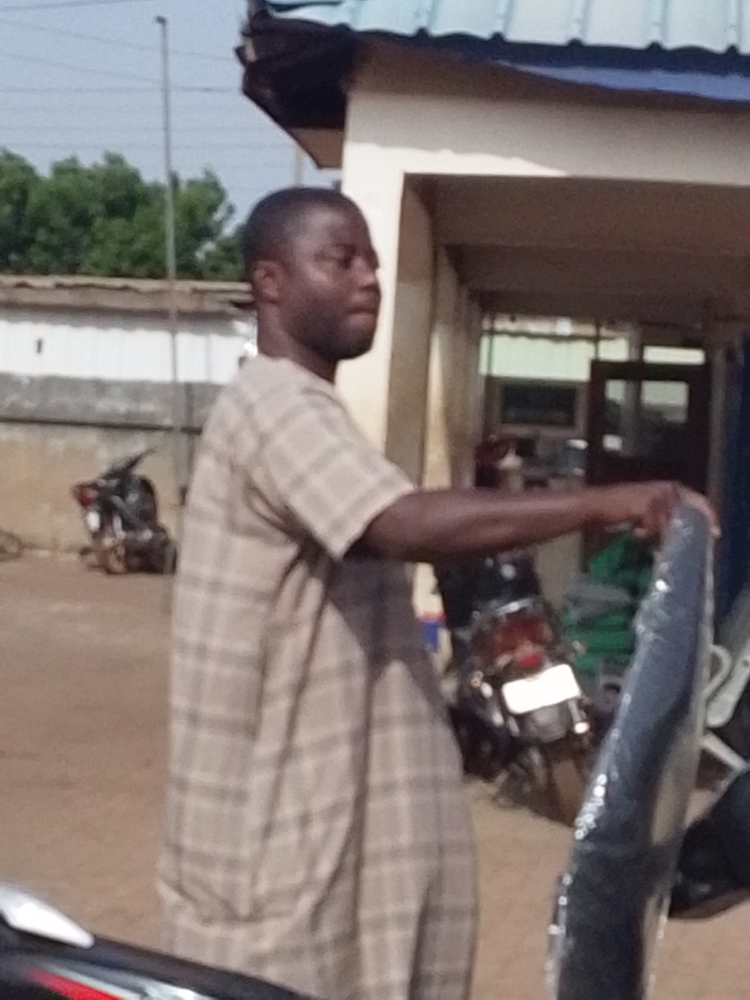 A medium, blurred shot shows a man in Tamale, Ghana, standing outdoors in front of a low building with an overhanging roof and holding a dark, possibly metallic, object covered in clear plastic wrap.…read more