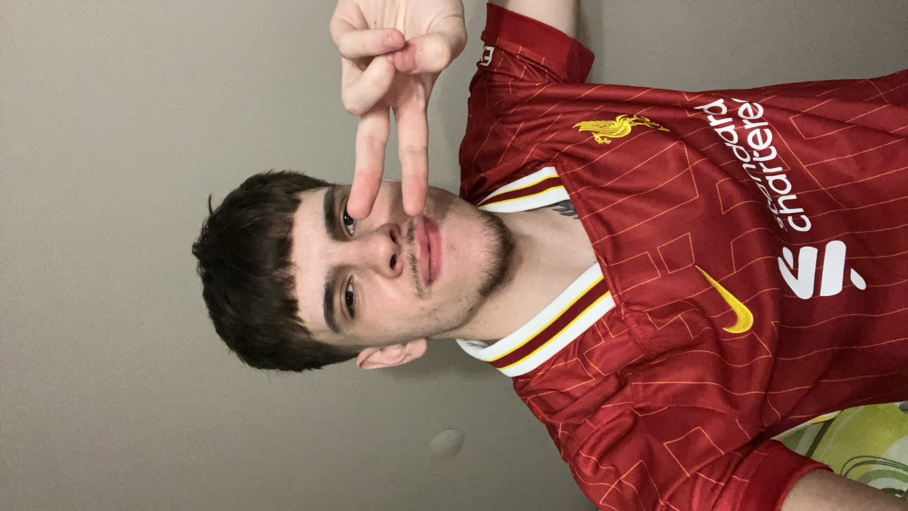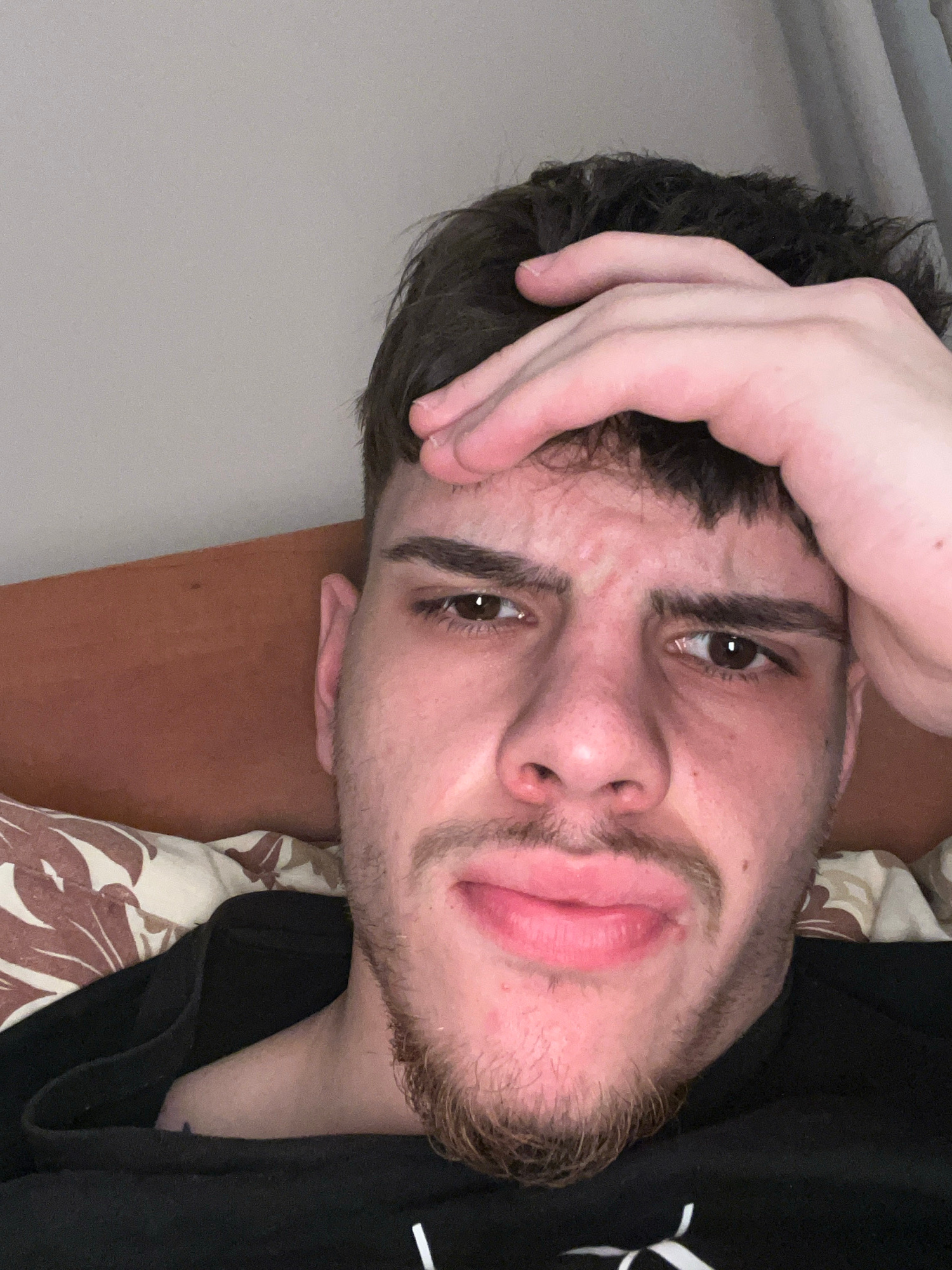 A young man is lying down, looking at the camera with a slight frown. He has dark hair, brown eyes, and a light beard. His right hand is resting on his forehead. He is wearing a black shirt and lying…read more