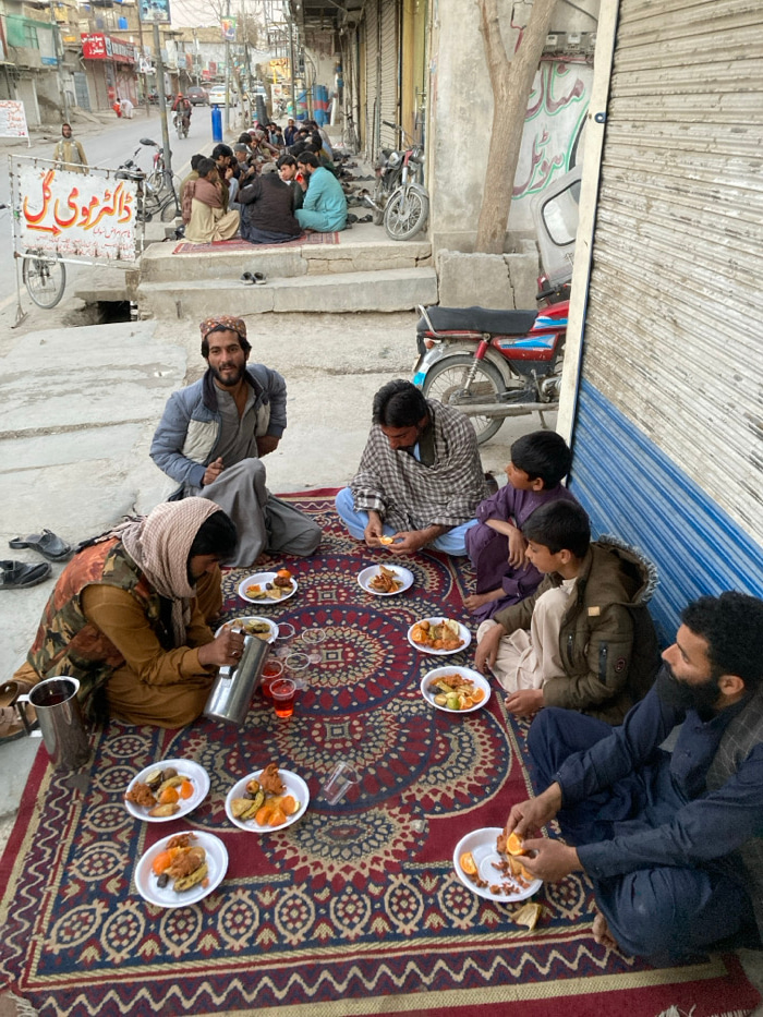 The image depicts an outdoor communal meal on a paved street or alleyway in Quetta City Tehsil, Pakistan. In the foreground, six males, consisting of men and boys, are seated cross-legged on a rectan…read more