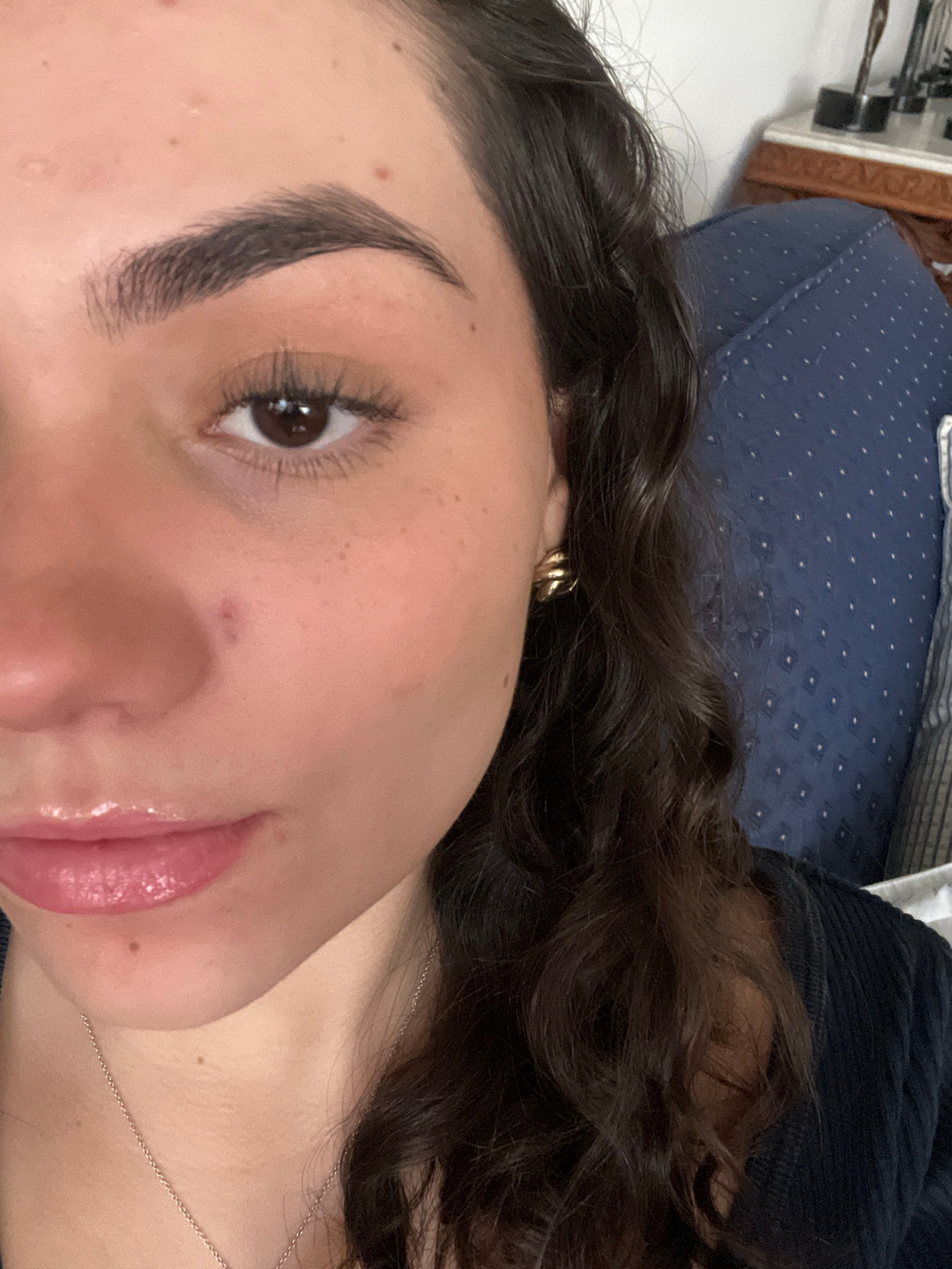 The image depicts a close-up view of a person's face, likely female, featuring dark, curly hair and fair skin. The person has a prominent eyebrow, a brown eye with visible lashes, and full lips with a…read more