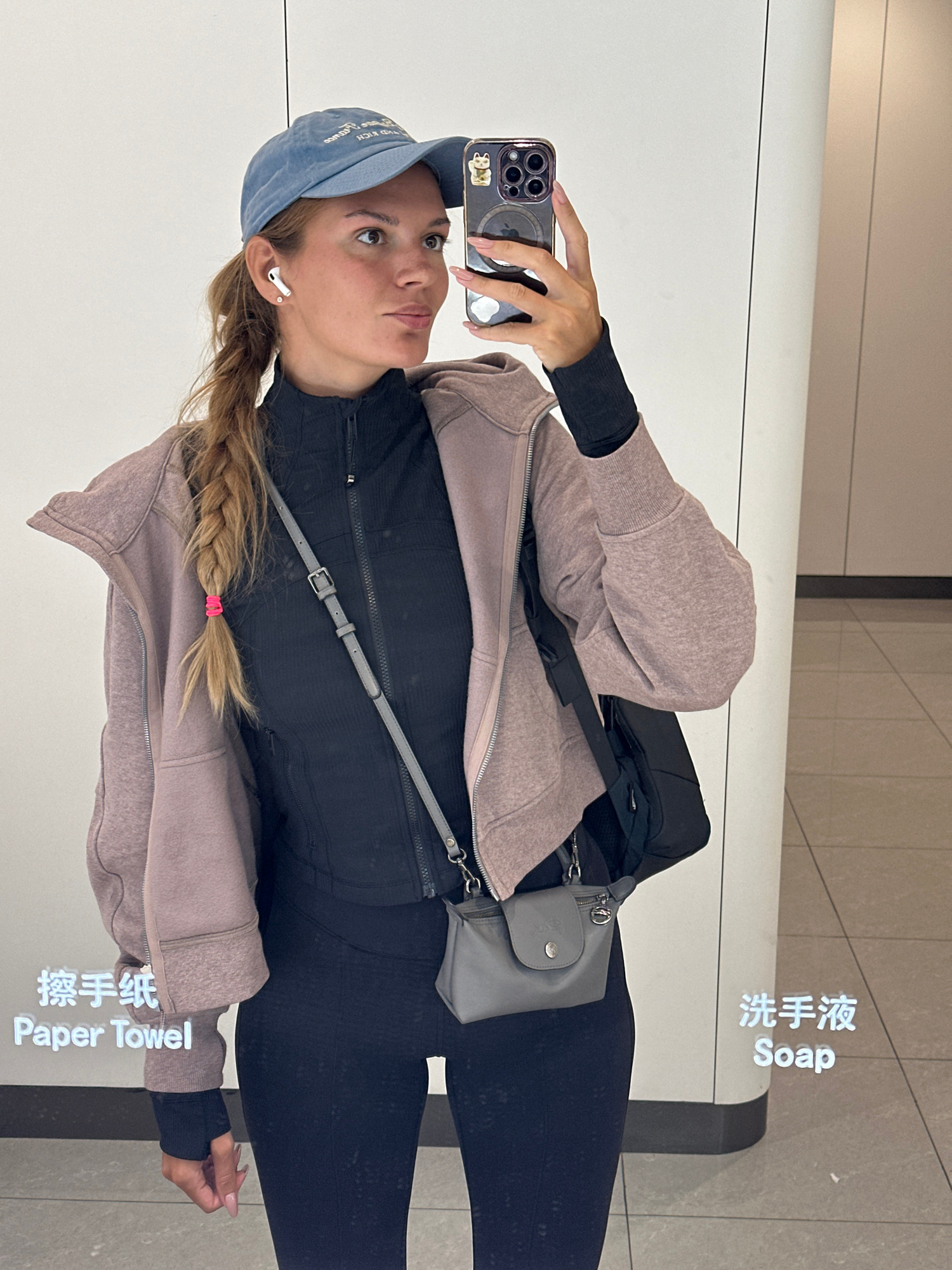 A woman is taking a mirror selfie in what appears to be a public restroom in Jianyang City, China. She is wearing black leggings and a black athletic top, with a mauve-colored hooded jacket. A blue ba…read more