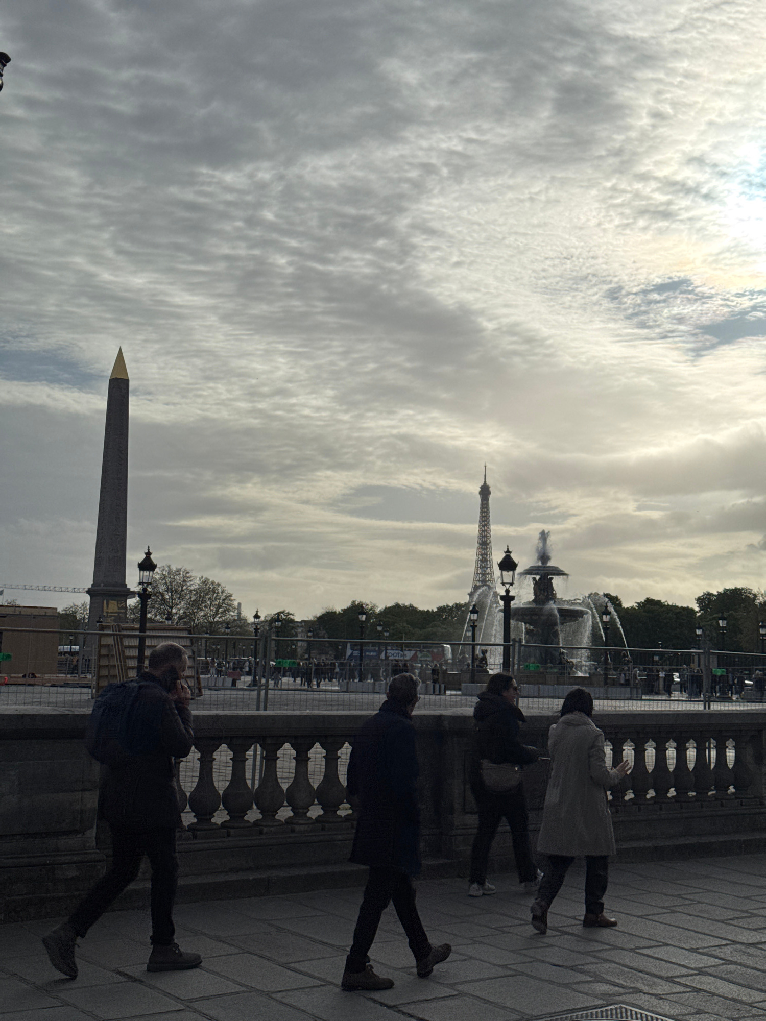 The photograph, taken in Paris, France, shows a view of the Place de la Concorde and the Eiffel Tower in the background. In the foreground, the Luxor Obelisk stands prominently. A fountain is situated…read more
