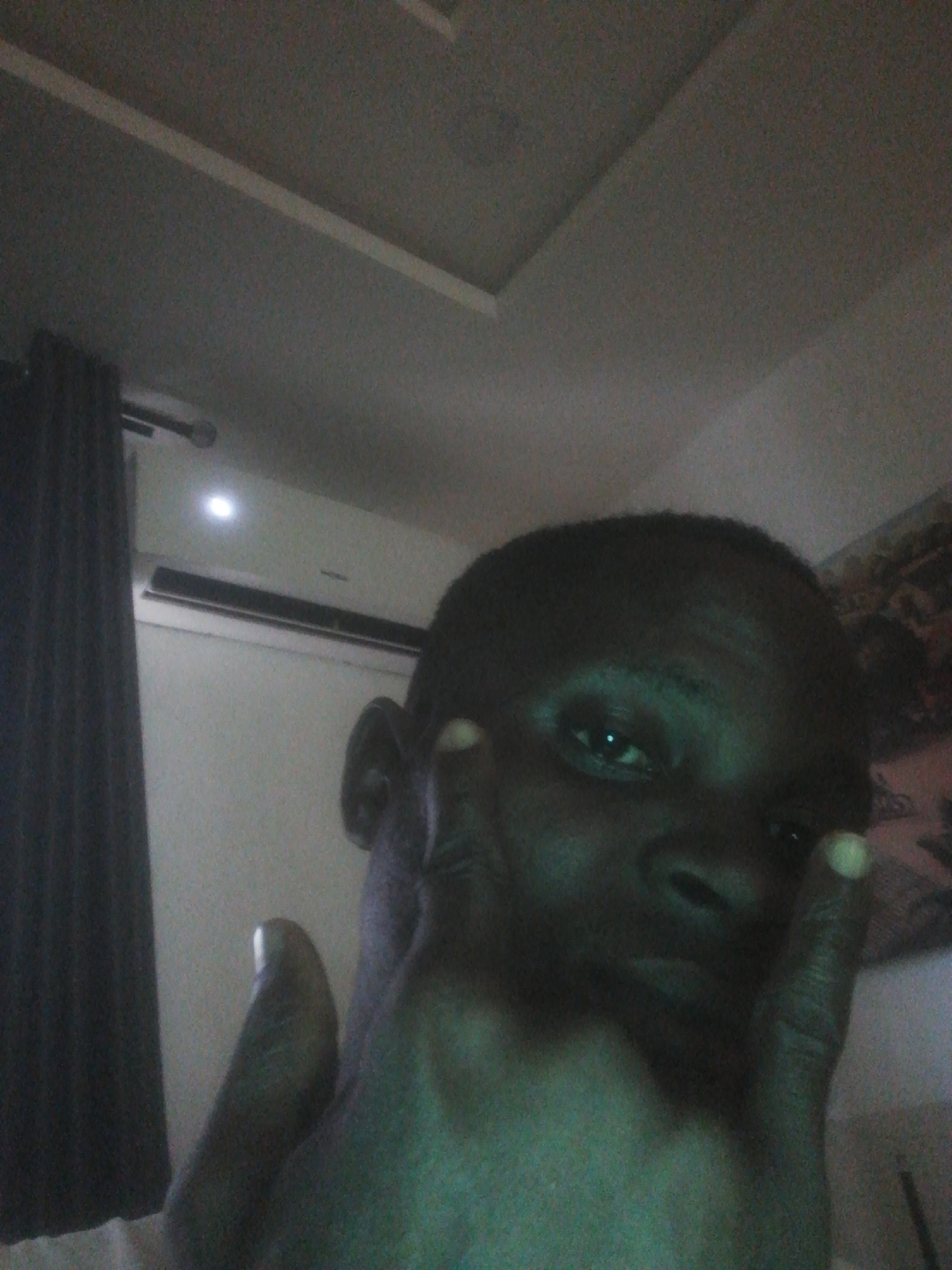 A close-up, poorly lit photograph shows a Black man in a room. His face is partially obscured by his hand. A curtain hangs on the left side of the frame, and an air conditioner unit is visible on theβ¦read more
