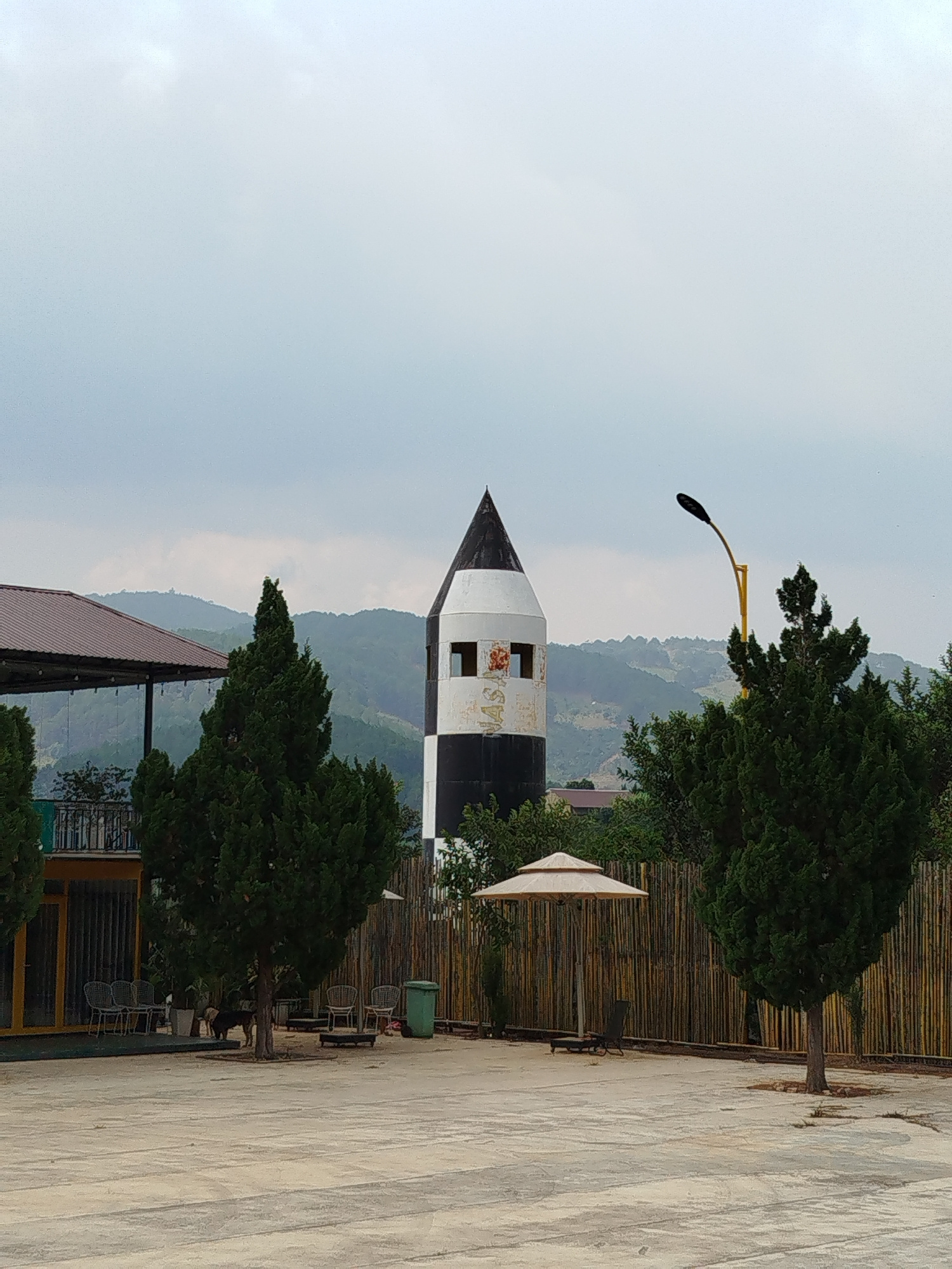 The image captures an outdoor scene at what appears to be a resort or recreational area, set against a backdrop of rolling hills under an overcast sky. In the center, a striking black and white tower…read more