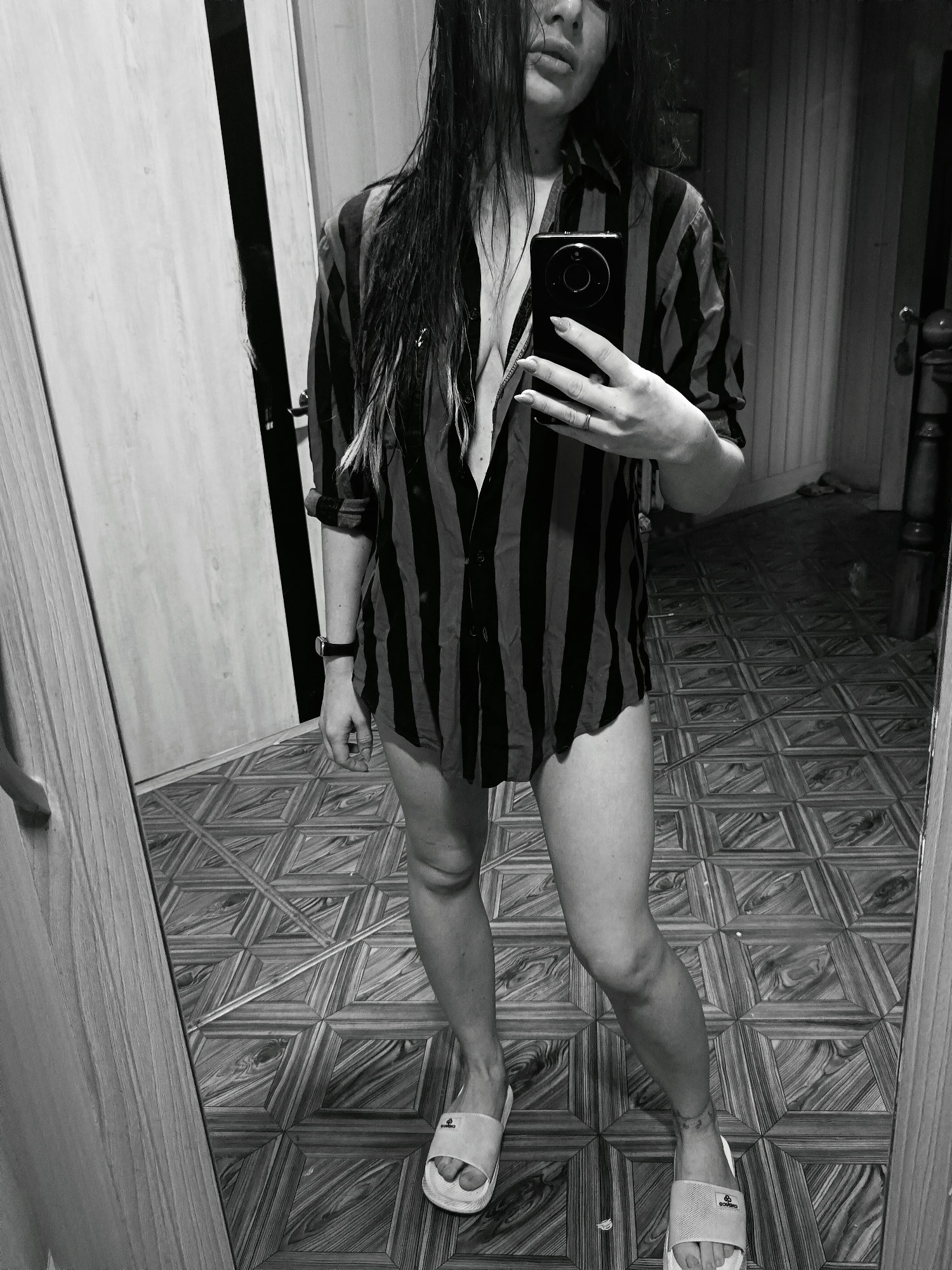 A woman stands in front of a mirror, taking a selfie. She is wearing an unbuttoned, vertically striped shirt and slides. Her long dark hair appears wet. The floor has a patterned tile design. The reflβ¦read more