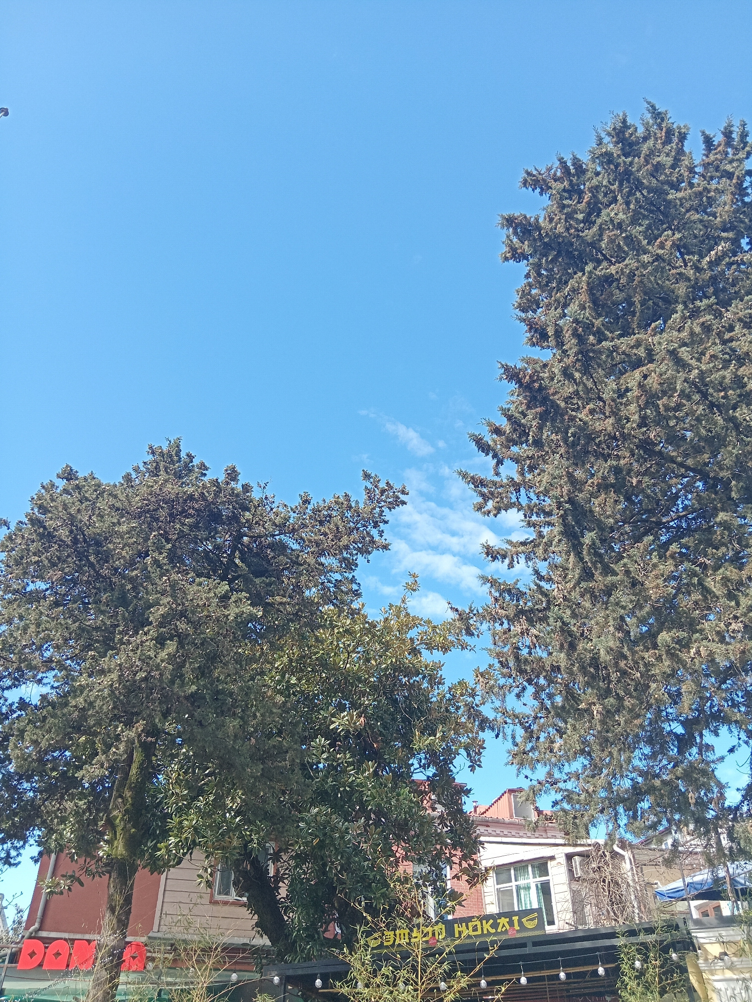 The image captures a view looking upwards, framed by trees on either side. The sky is clear blue with a few wispy clouds in the center. On the right side of the image, a building is partially visible,…read more