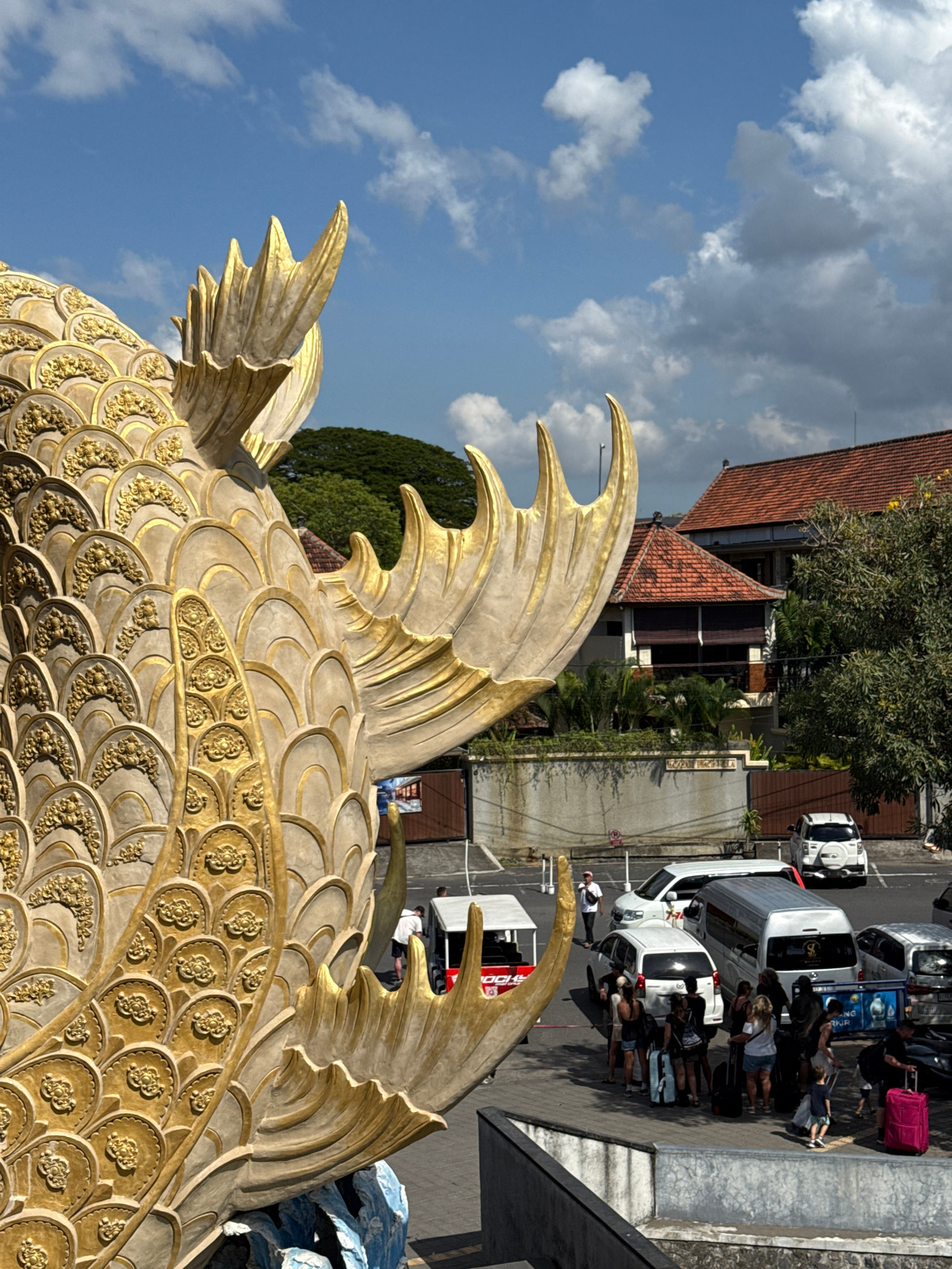 The image captures a scene near the Bali Ngurah Rai International Airport in Denpasar, Indonesia. In the foreground is a large, golden fish statue with detailed scales and decorative patterns, occupyi…read more