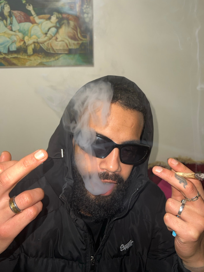 An adult male is depicted in an indoor setting, identified as a location in the city of Tanger, Morocco. The subject possesses dark hair, a full dark beard, and a mustache, and is wearing black wrapar…read more