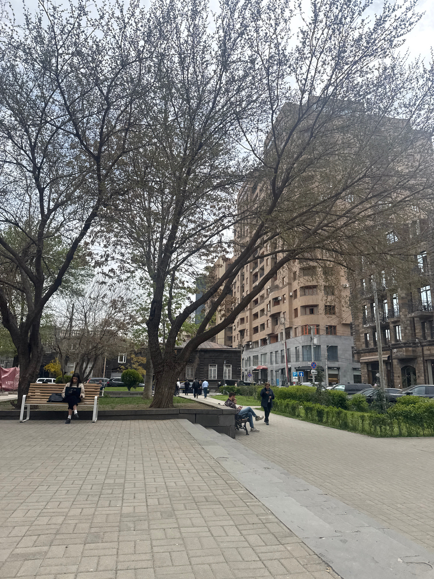 The image depicts a street scene in Yerevan, Armenia, featuring a tree-lined walkway with benches. Several people are seated on the benches. The walkway is paved with interlocking concrete pavers. Beh…read more