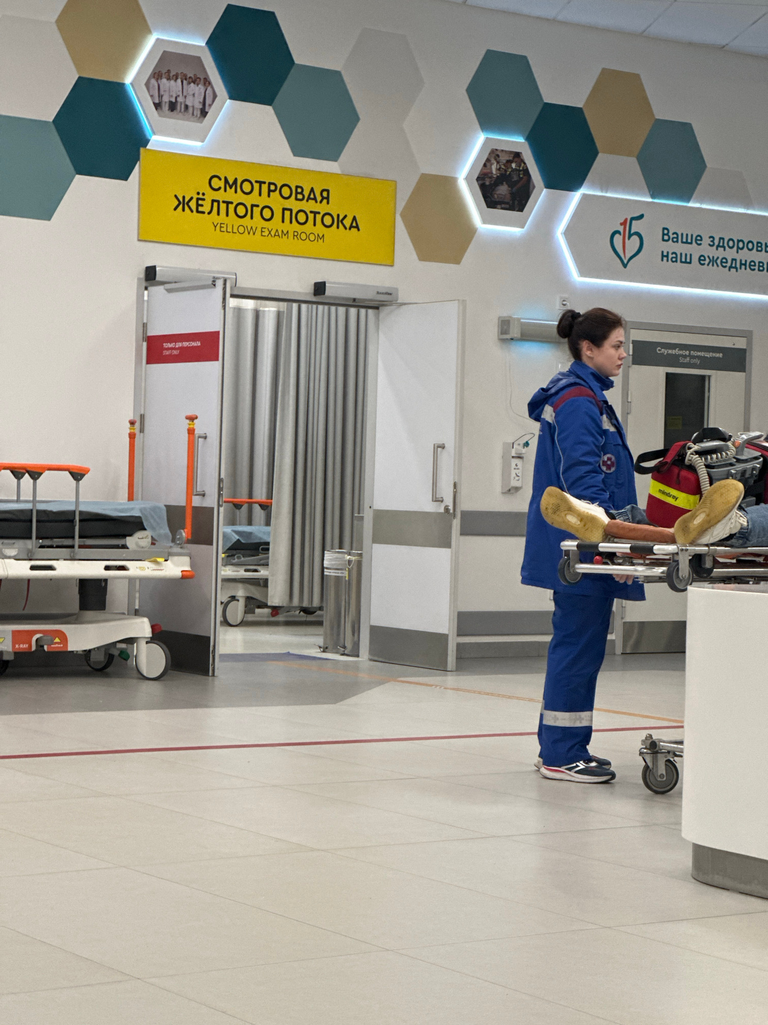The image shows the interior of a medical facility. A female paramedic in a blue uniform is standing next to a stretcher. A sign on the wall reads "YELLOW EXAM ROOM". Another sign has Russian text and…read more