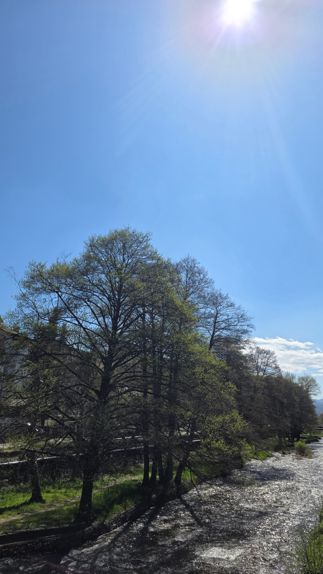 The image shows a view of a tree-lined area with a water body, possibly a river or canal. The sky is predominantly blue with a bright light source in the upper left, possibly the sun. The trees are va…read more