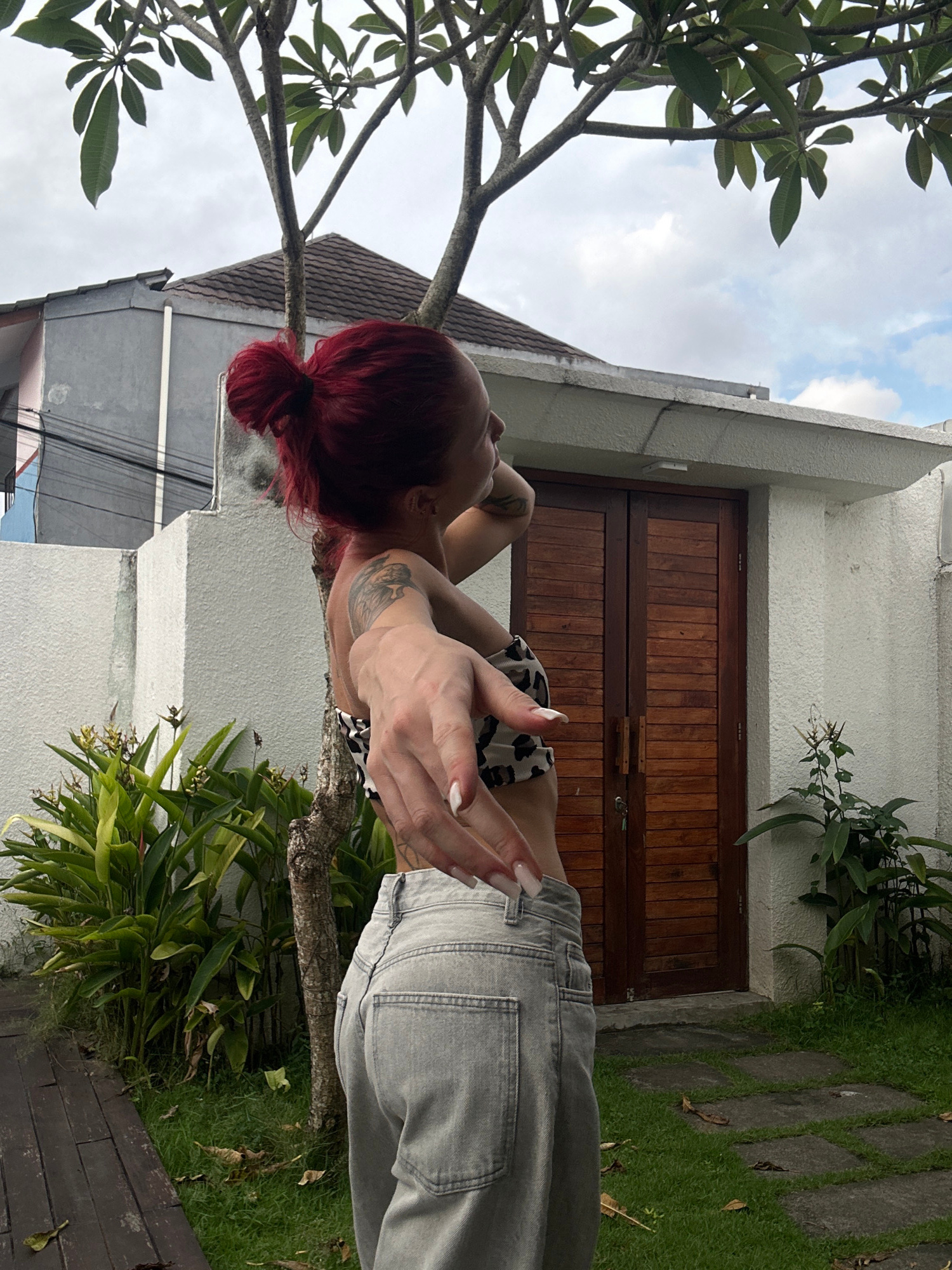 The image, taken in Dalung, Indonesia, shows a woman with red hair in a bun and a tattoo on her left arm. She is wearing a spotted top and light grey jeans. She is positioned in front of a white build…read more