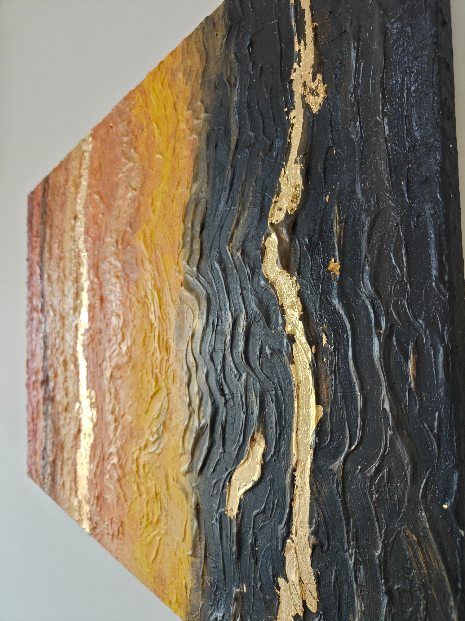 The image is a close-up of a textured, abstract painting. The painting has a distinct color gradient, transitioning from shades of red and yellow on the left side to dark gray and black on the right.β¦read more