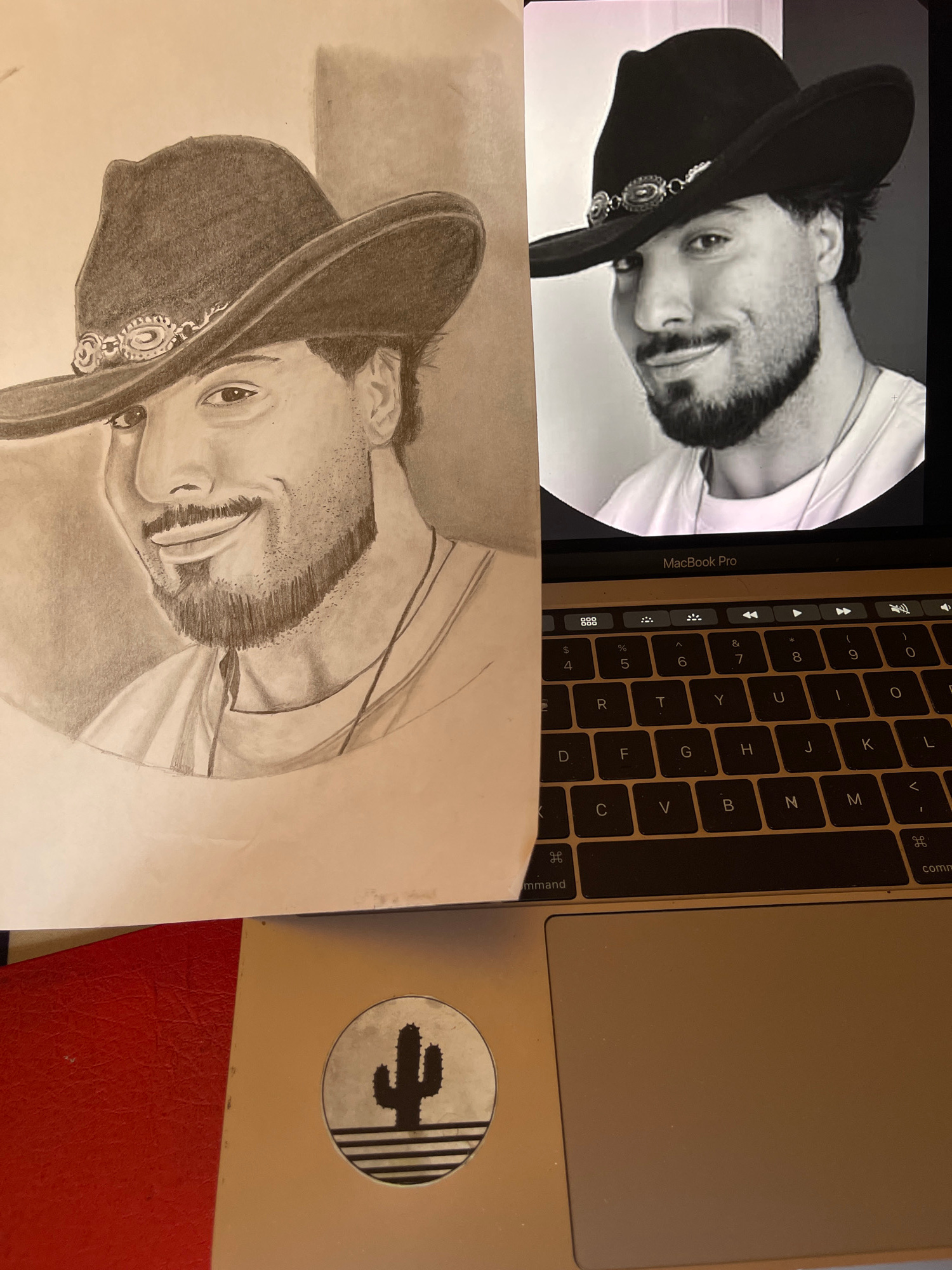 The image shows a charcoal drawing of a man wearing a cowboy hat, positioned next to a laptop displaying a black and white photograph of the same man. The laptop keyboard is visible, showing "MacBook…read more