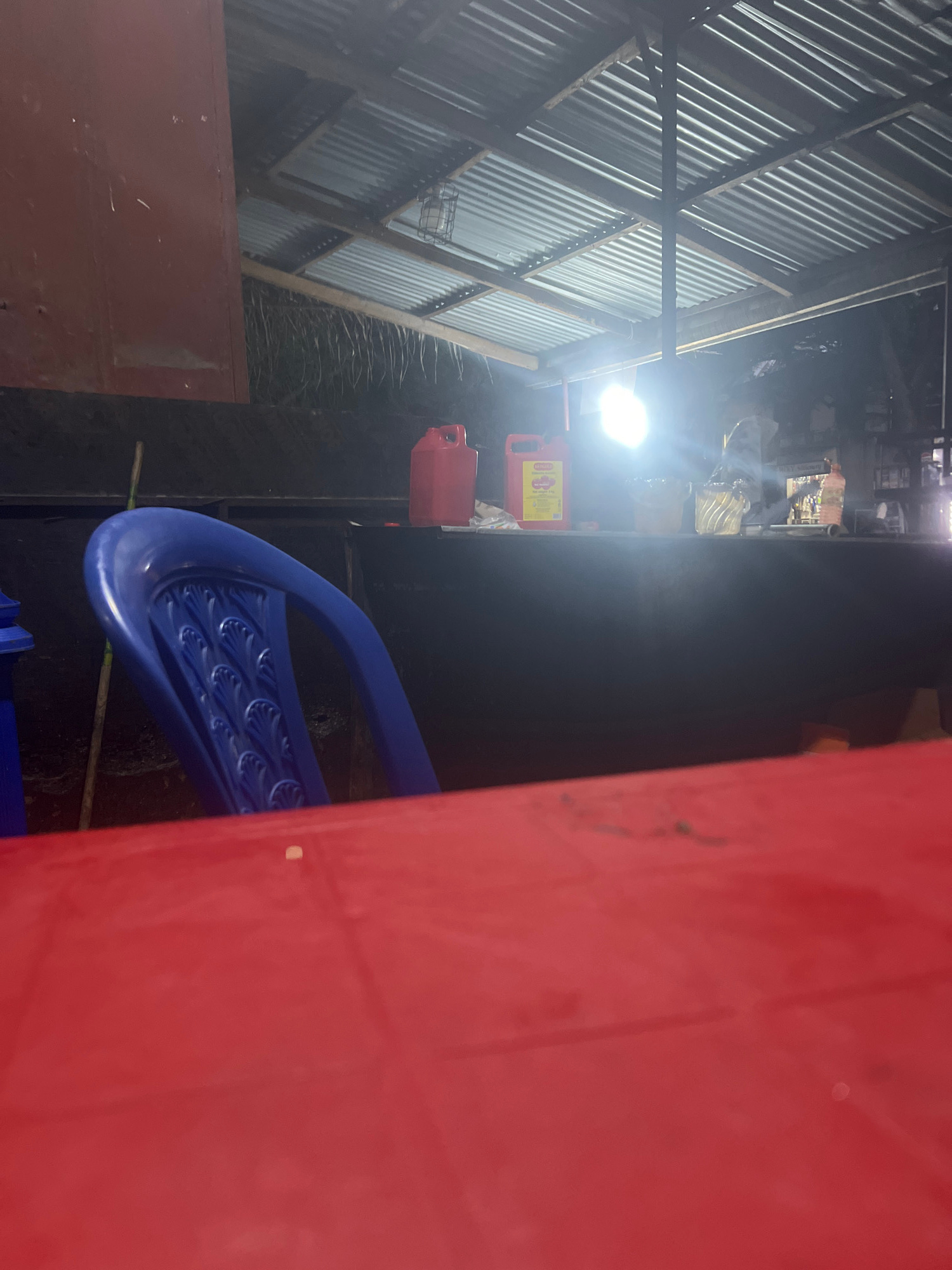 The image shows a partially visible red structure, possibly a building or large object, dominating the right side of the frame. A blue structure with patterned detailing is positioned near the bottom.…read more