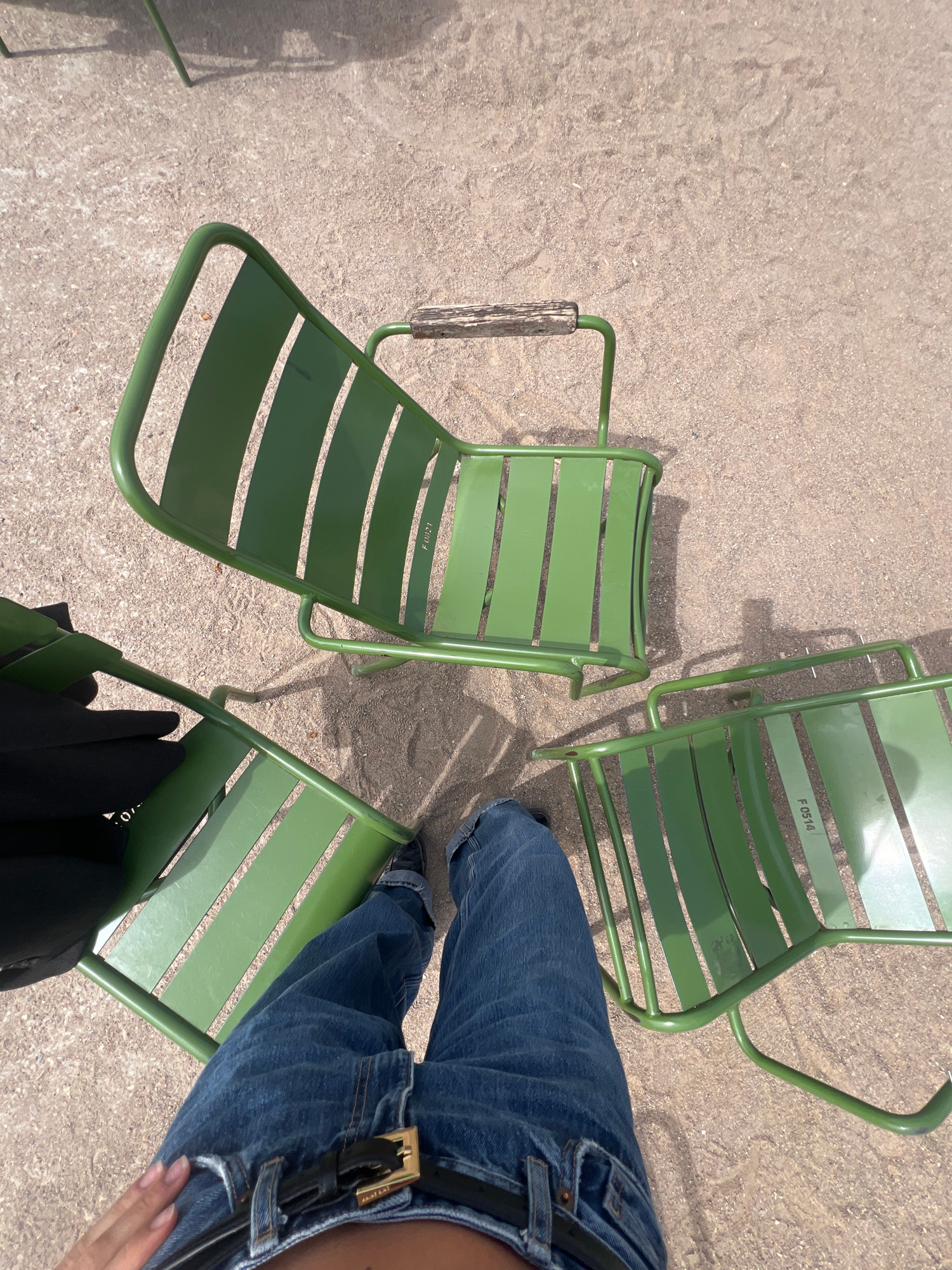 The image presents an overhead view of an outdoor setting, likely a park in Paris, France, under bright daylight. Three distinctive green metal chairs with slatted seats and backs are scattered on a l…read more