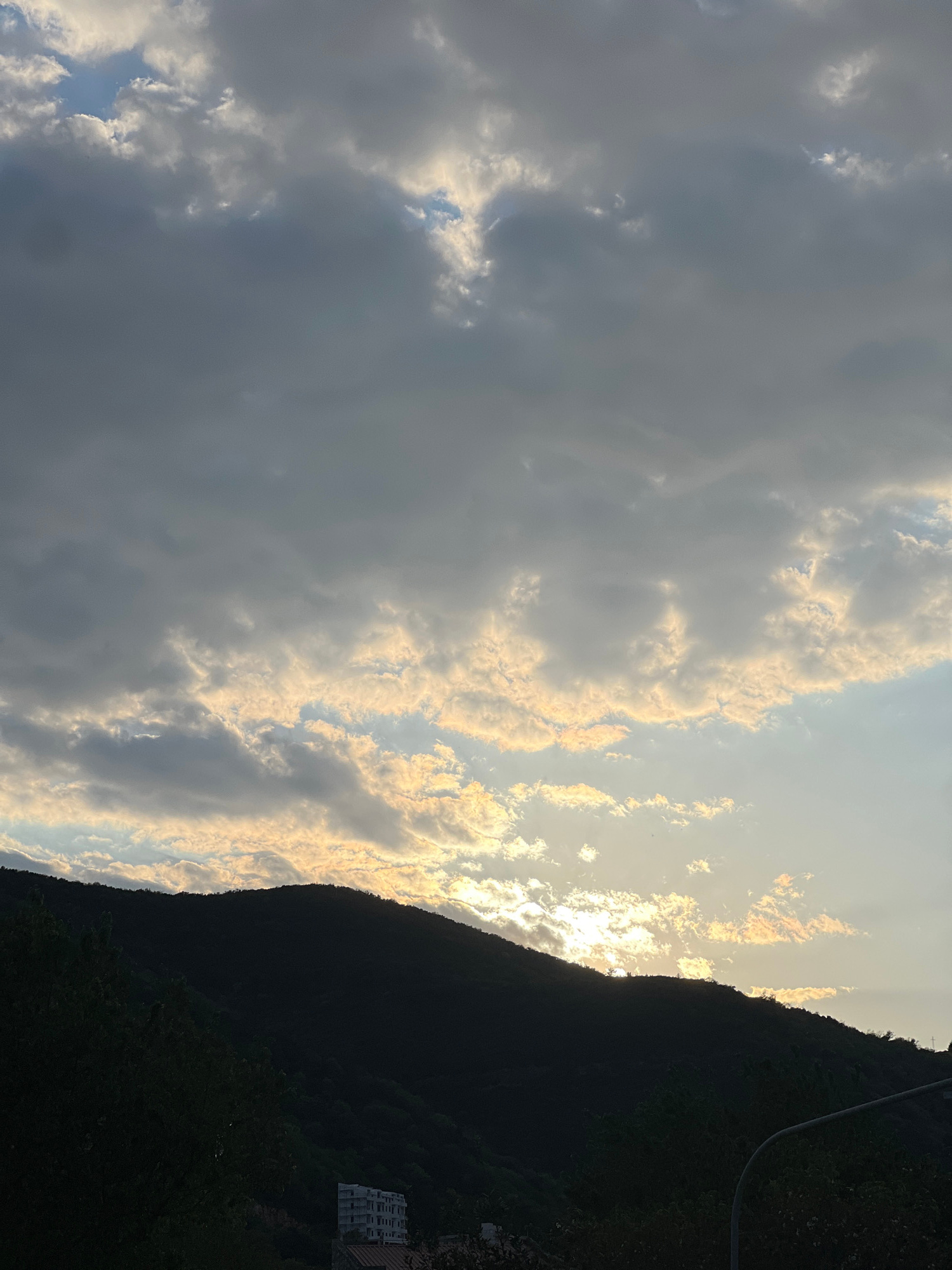 The image shows a landscape scene, possibly near the city of Budva, Montenegro. The sky is filled with a mix of dark and light clouds, hinting at either an approaching storm or a sunset. A sunlit area…read more