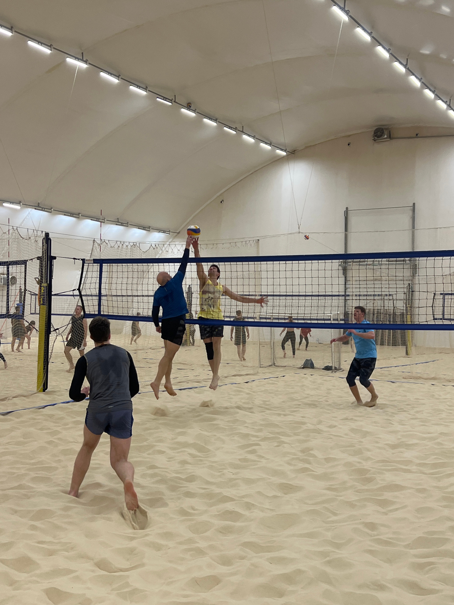 The image depicts a beach volleyball game being played indoors on a sand court. A volleyball net divides the court, with several players engaged in the game on both sides. One player in a blue shirt i…read more