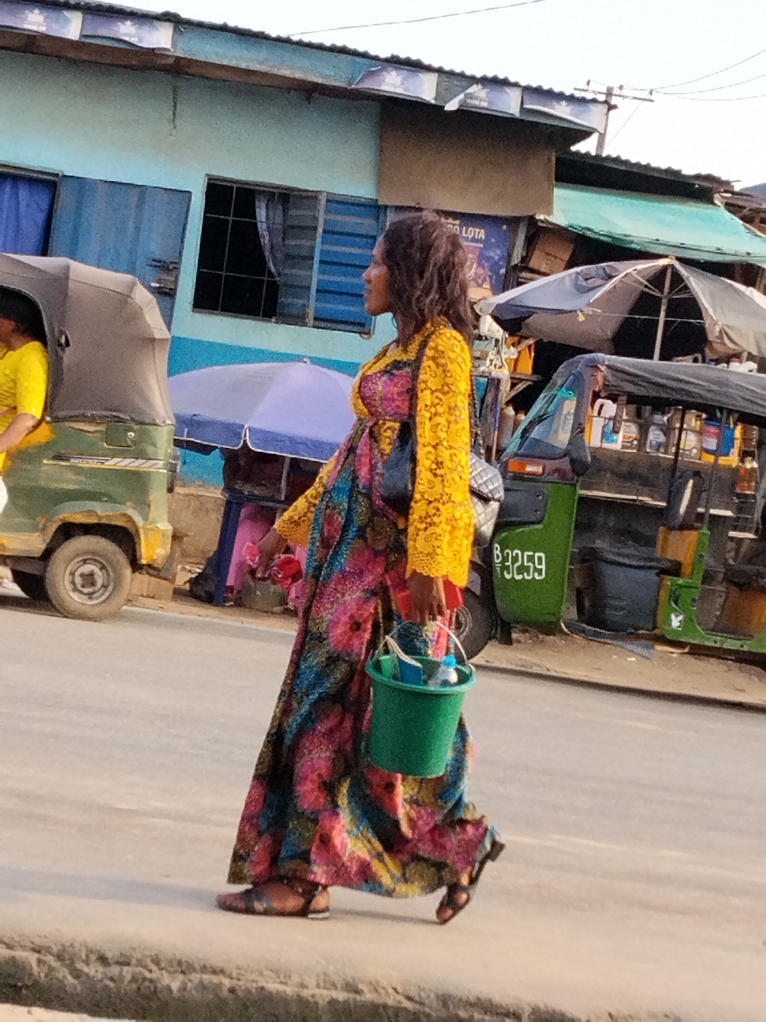 A woman walks along a paved road in Aba, Nigeria. She is wearing a long, patterned dress with a yellow lace top and carrying a green bucket filled with blue and white objects. In the background, there…read more