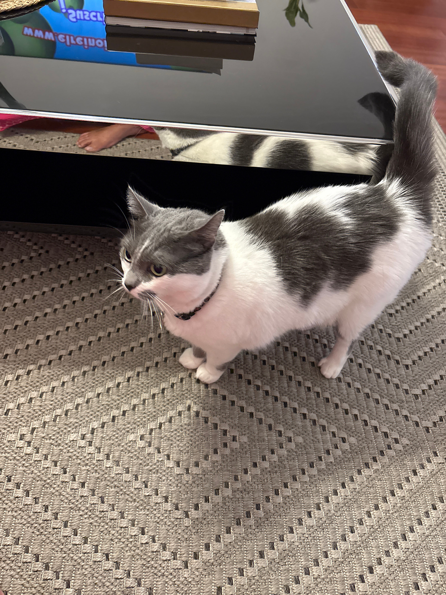 A grey and white cat lies on a woven grey rug. The cat is partially on a black glass table. Books are stacked to the left of the table. A portion of a human foot is visible under the table. The locati…read more