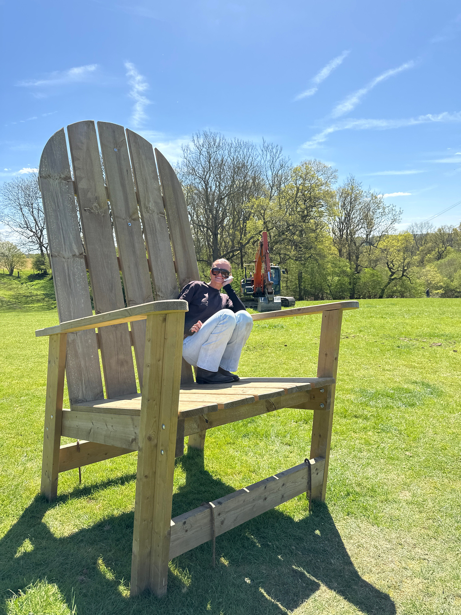The image captures a sunny outdoor scene in Sevenoaks, United Kingdom, where a person is seated in an oversized wooden Adirondack chair placed on a grassy field. The individual, wearing sunglasses, a…read more