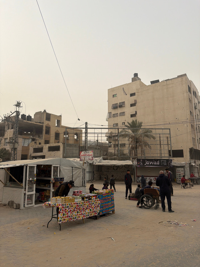 A street scene shows damaged buildings with bullet holes in a war-torn area. Market stalls line the street, displaying goods for sale. People are seen walking around, some with a wheelchair. A tall bu…read more