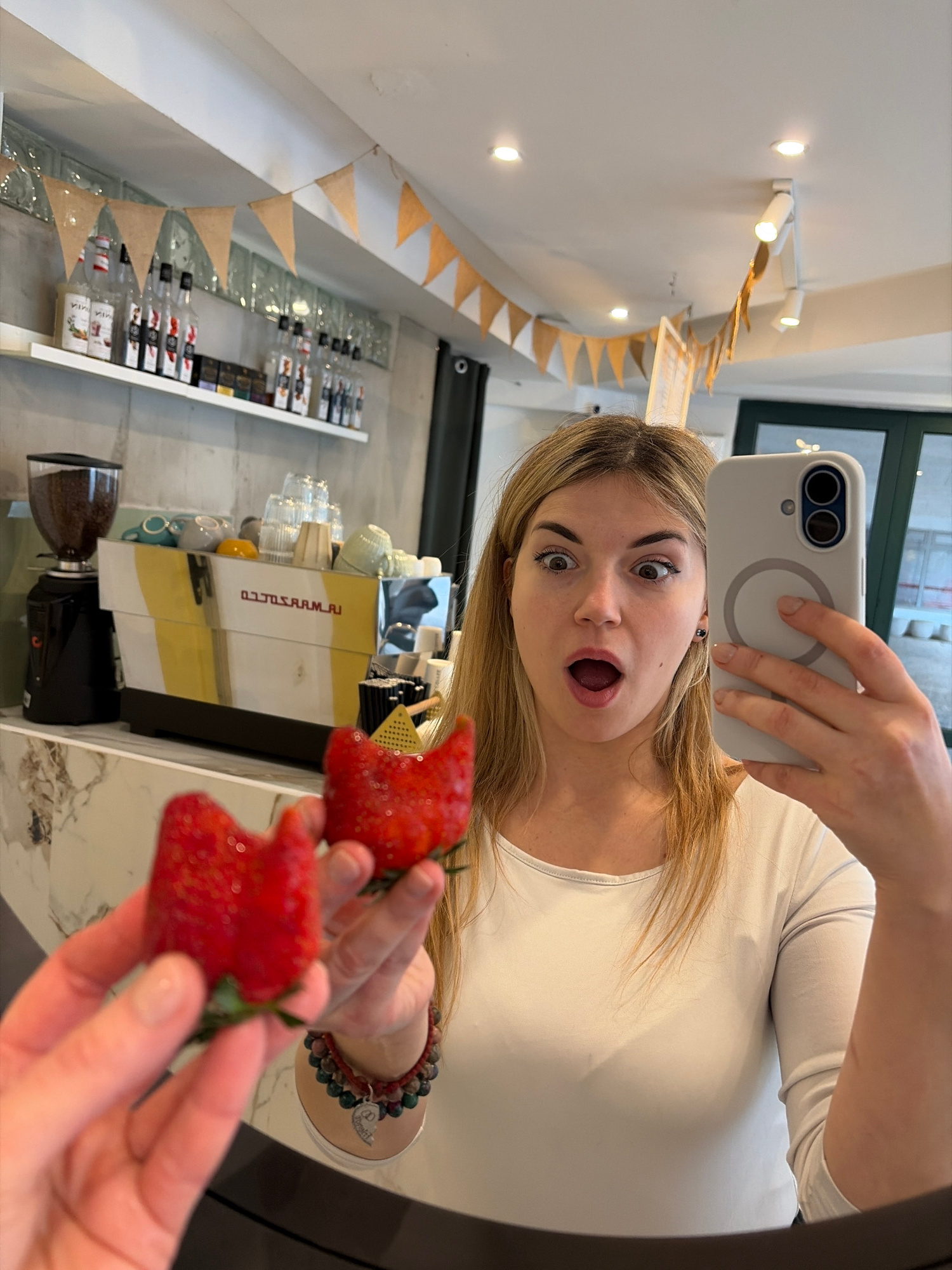 A woman with blond hair is taking a selfie while holding two strawberries. She is wearing a white long-sleeved shirt and a bracelet with beads. The background appears to be a cafe or bar with a shelf…read more